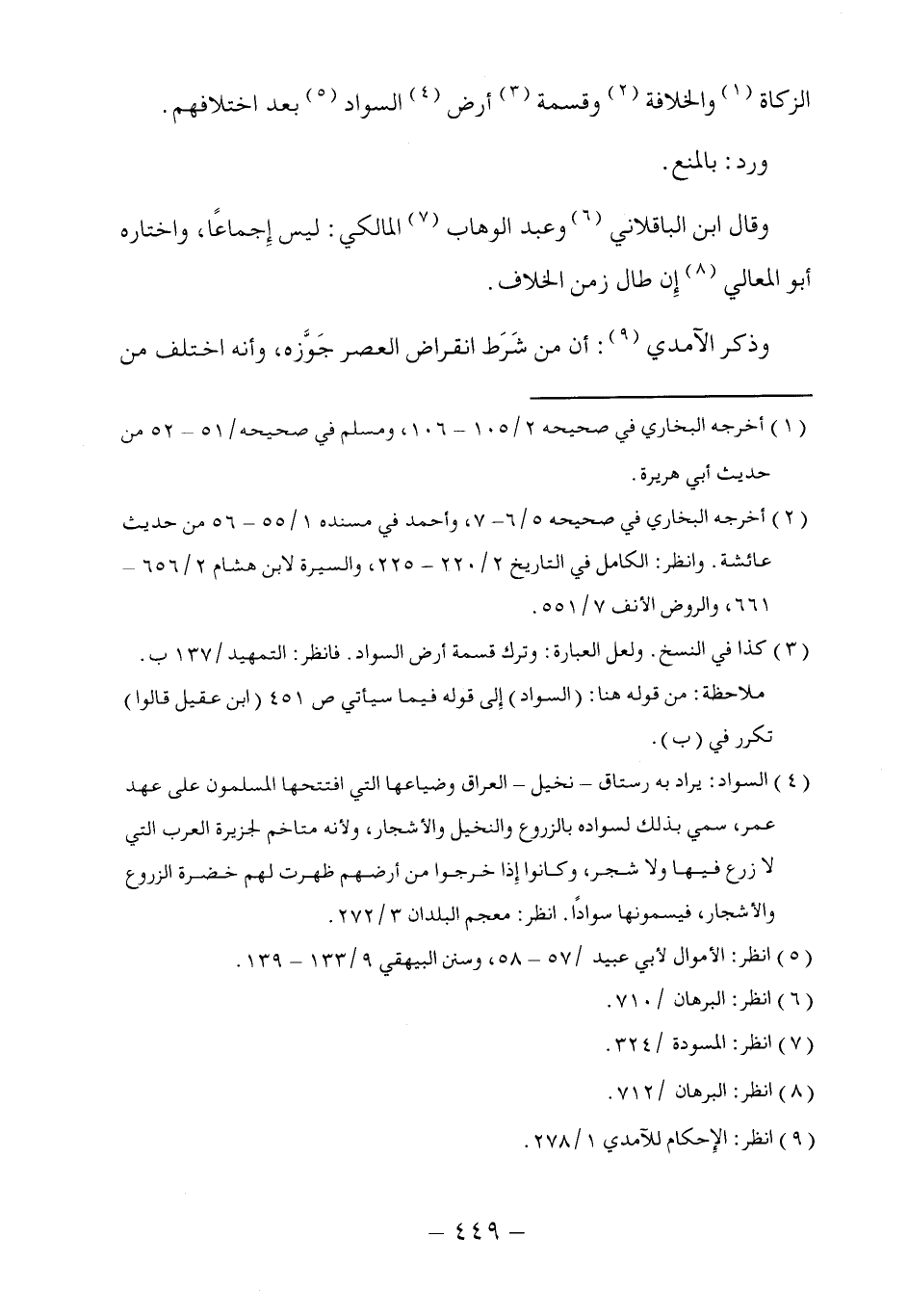 (٣) كذا في النسخ. ولعل العبارة: وترك قسمة أرض السواد. فانظر: التمهيد/ ١٣٧ ب.