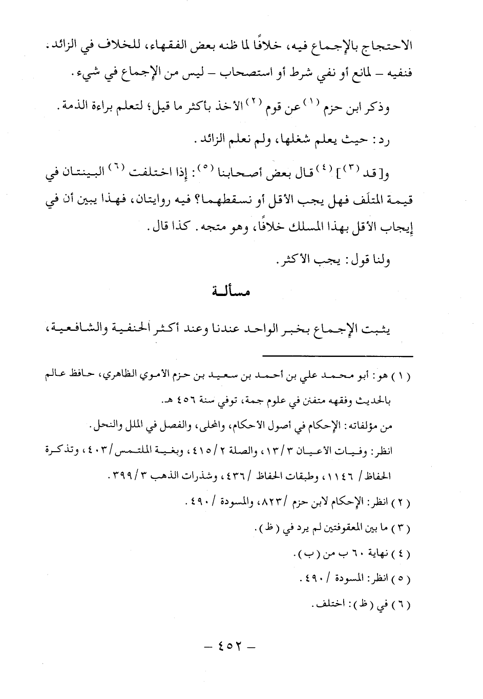 الاحتجاج بالإِجماع فيه، خلافًا لما ظنه بعض الفقهاء، للخلاف في الزائد. فنفيه -لمانع أو نفي شرط أو استصحاب- ليس من الإِجماع في شيء.