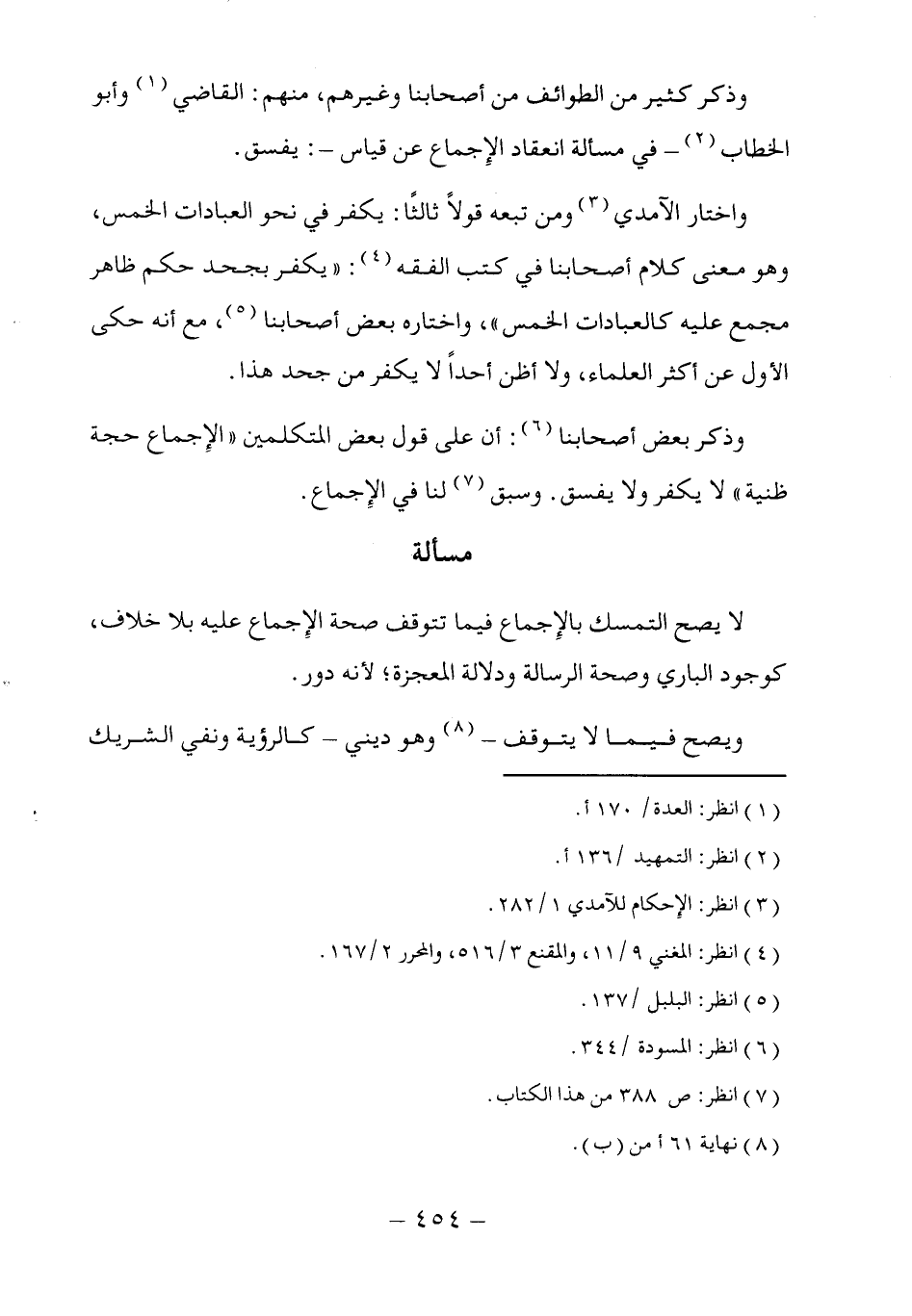 وذكر بعض أصحابنا (٦): أن على قول بعض المتكلمين "الإِجماع حجة ظنية" لا يكفر ولا يفسق. وسبق (٧) لنا في الإِجماع.