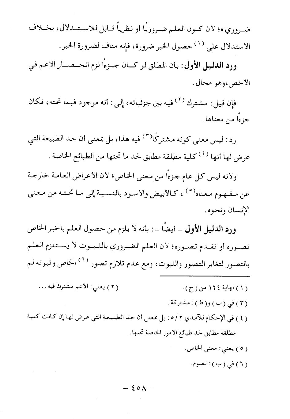 (٤) في الإِحكام للآمدي ٢/ ٥: بل بمعنى أن حد الطبيعة التي عرض لها إِن كانت كلية مطلقة مطابق لحد طبائع الأمور الخاصة تحتها.