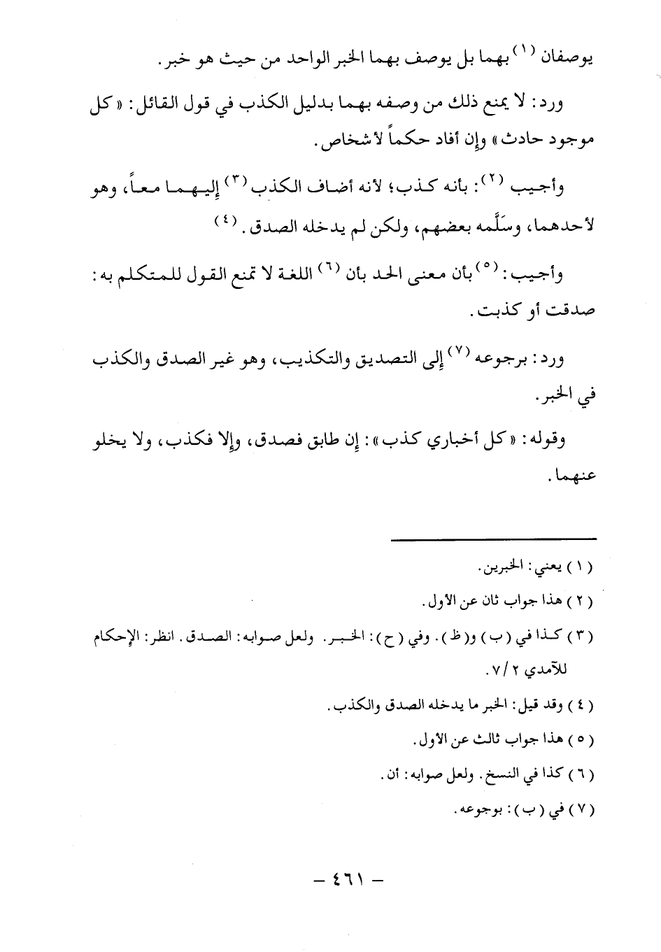 ورد: برجوعه (٧) إِلى التصديق والتكذيب، وهو غير الصدق والكذب في الخبر.
