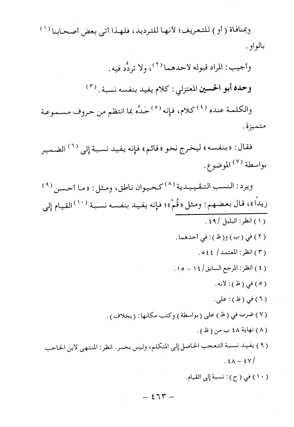 وحده أبو الحسين المعتزلي: كلام يفيد بنفسه نسبة. (٣)