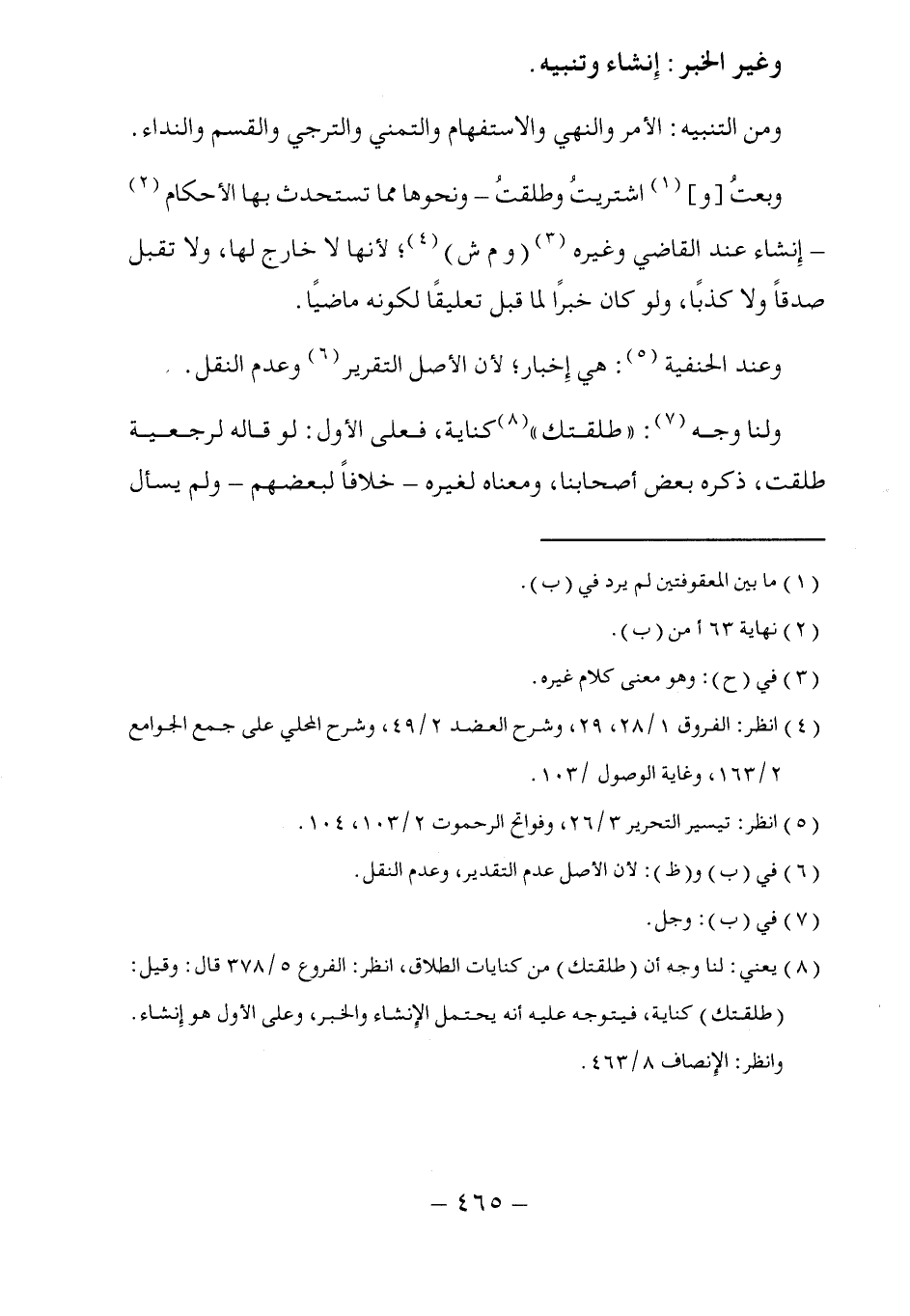 (٨) يعني: لنا وجه أن (طلقتك) من كنايات الطلاق، انظر: الفروع ٥/ ٣٧٨ قال: وقيل: (طلقتك) كناية، فيتوجه عليه أنه يحتمل الإِنشاء والخبر، وعلى الأول هو إِنشاء. وانظر: الإِنصاف ٨/ ٤٦٣.
