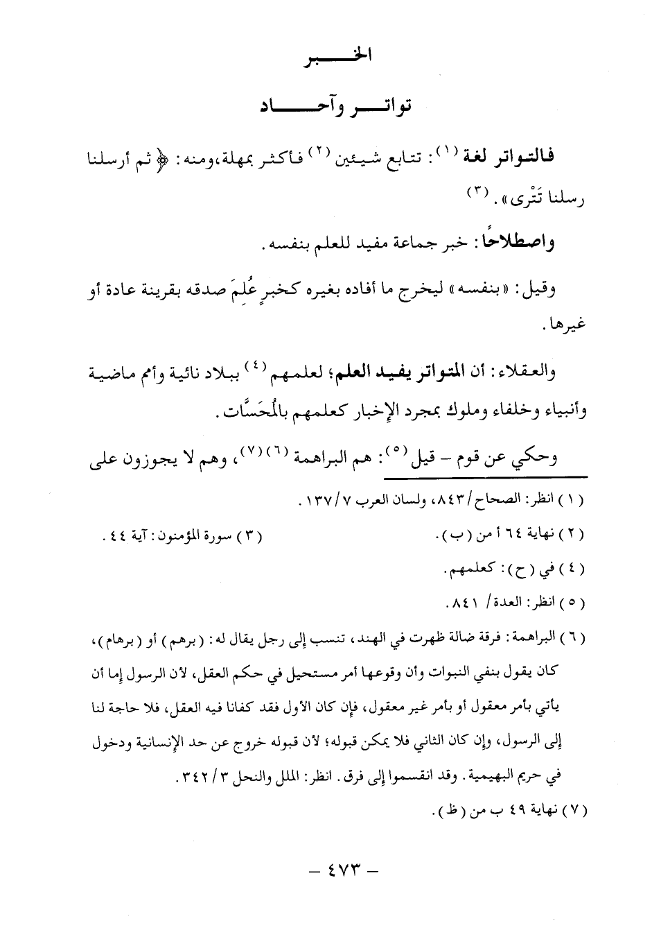والعقلاء: أن التواتر يفيد العلم، لعلمهم (٤) ببلاد نائية وأمم ماضية وأنبياء وخلفاء وملوك بمجرد الإِخبار كعلمهم بالمُحَسَّات.