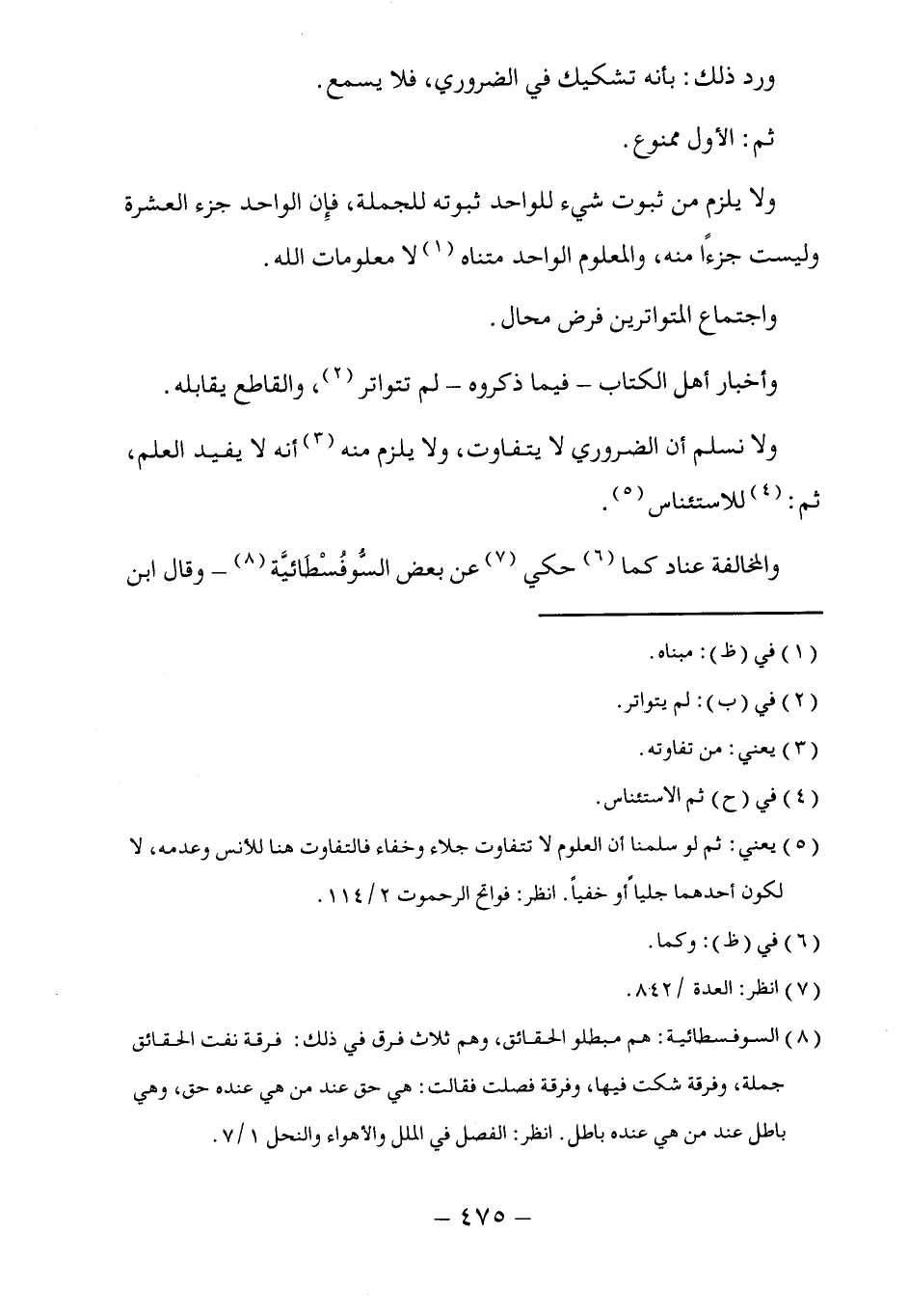 (٨) السوفسطائية: هم مبطلو الحقائق، وهم ثلاث فرق في ذلك: فرقة نفت الحقائق جملة، وفرقة شكت فيها، وفرقة فصلت فقالت: هي حق عند من هي عنده حق، وهي باطل عند من هي عنده باطل. انظر: الفصل في الملل والأهواء والنحل ١/ ٧.