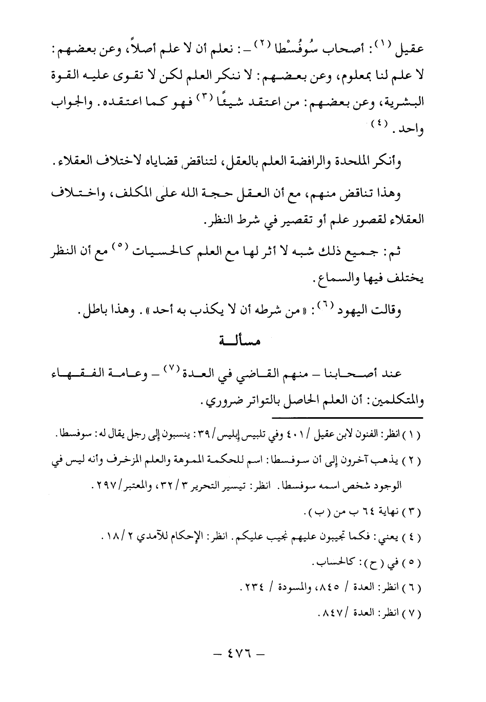 عقيل (١): أصحاب سُوفُسْطا (٢) -: نعلم أن لا علم أصلاً، وعن بعضهم: لا علم لنا بمعلوم، وعن بعضهم: لا ننكر العلم لكن لا تقوى عليه القوة البشرية، وعن بعضهم: من اعتقد شيئًا (٣) فهو كما اعتقده. والجواب واحد. (٤)