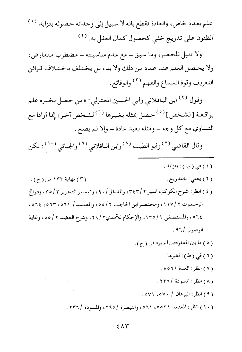 علم بعدد خاص، والعادة تقطع بأنه لا سبيل إِلى وجدانه لحصوله بتزايد (١) الظنون على تدريج خفي كحصول كمال العقل به. (٢)
