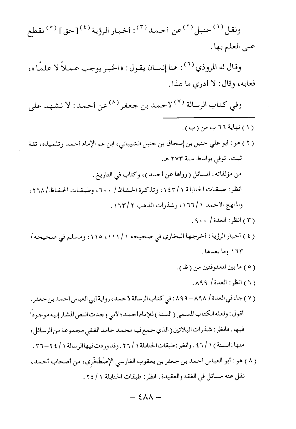 (٧) جاء في العدة/ ٨٩٨ - ٨٩٩: في كتاب الرسالة لأحمد، رواية أبي العباس أحمد بن جعفر. أقول: ولعله الكتاب المسمى (السنة) للإمام أحمد؛ لأني وجدت النص المشار إِليه موجودًا فيها. فانظر: شذرات البلاتين (الذي جمع فيه محمَّد حامد الفقي مجموعة من الرسائل، منها: السنة) ١/ ٤٦. وانظر: طبقات الحنابلة ١/ ٢٦. وقد وردت فيها الرسالة ١/ ٢٤ - ٣٦.