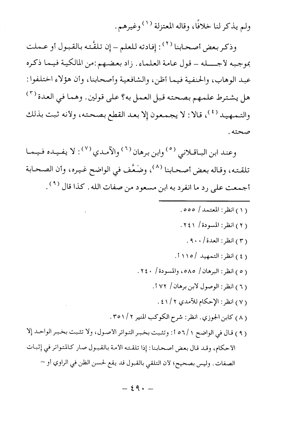 (٩) قال في الواضح ١/ ١٥٦: وتثبت بخبر التواتر الأصول، ولا تثبت بخبر الواحد إِلا الأحكام، وقد قال بعض أصحابنا: إِذا تلقته الأمة بالقبول صار كالمتواتر في إِثبات الصفات. وليس بصحيح؛ لأن التلقي بالقبول قد يقع لحسن الظن في الراوي أو=