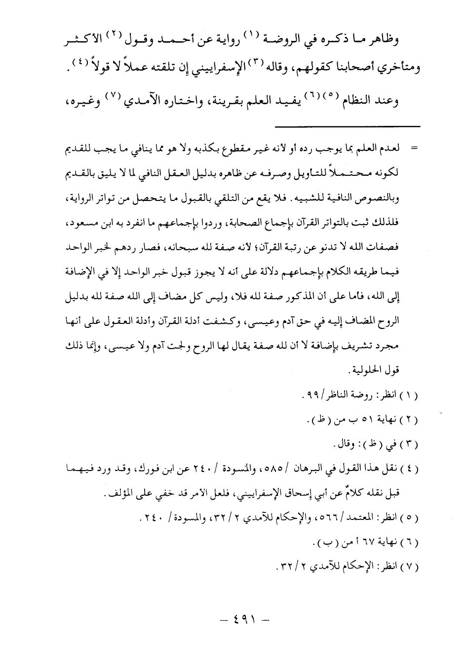 =لعدم العلم بما يوجب رده أو لأنه غير مقطوع بكذبه ولا هو مما ينافي ما يجب للقديم لكونه محتملاً للتأويل وصرفه عن ظاهره بدليل العقل النافي لما لا يليق بالقديم وبالنصوص النافية للشبيه. فلا يقع من التلقي بالقبول ما يتحصل من تواتر الرواية، فلذلك ثبت بالتواتر القرآن بإجماع الصحابة، وردوا بإِجماعهم ما انفرد به ابن مسعود، فصفات الله لا تدنو عن رتبة القرآن؛ لأنه صفة لله سبحانه، فصار ردهم لخبر الواحد فيما طريقه الكلام بإِجماعهم دلالة على أنه لا يجوز قبول خبر الواحد إِلا في الإِضافة إِلى الله، فأما على أن المذكور صفة لله فلا، وليس كل مضاف إِلى الله صفة لله بدليل الروح المضاف إِليه في حق آدم وعيسى، وكشفت أدلة القرآن وأدلة العقول على أنها مجرد تشريف بإِضافة لا أن لله صفة يقال لها الروح ولجت آدم ولا عيسى، وإينما ذلك قول الحلولية.