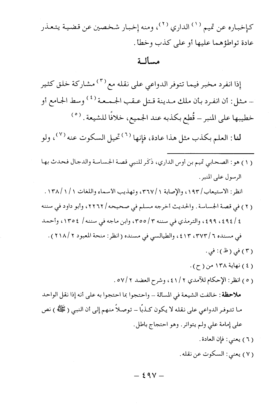 ملاحظة: خالفت الشيعة في المسألة -واحتجوا بما احتجوا به على أنه إِذا نقل الواحد ما تتوفر الدواعي على نقله لايكون كذباً- توصلاً منهم إِلى أن النبي - صلى الله عليه وسلم - على إِمامة علي ولم يتواتر. وهو احتجاج باطل.