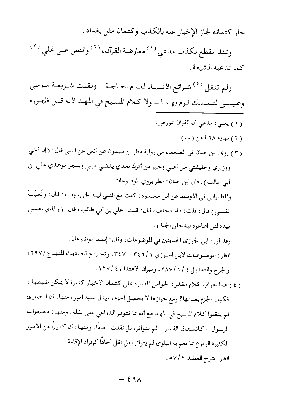 (٤) هذا جواب كلام مقدر: الحوامل المقدرة على كتمان الأخبار كثيرة لا يمكن ضبطها، فكيف الحزم بعدمها؟ ومع جوازها لا يحصل الجزم، ويدل عليه أمور، منها: أن النصارى لم ينقلوا كلام المسيح في المهد مع أنه مما تتوفر الدواعي على نقله. ومنها: معجزات الرسول -كانشقاق القمر- لم تتواتر، بل نقلت آحادًا. ومنها: أن كثيراً من الأمور الكثيرة الوقوع مما تعم به البلوى لم يتواتر، بل نقل آحادًا كإِفراد الإِقامة ...