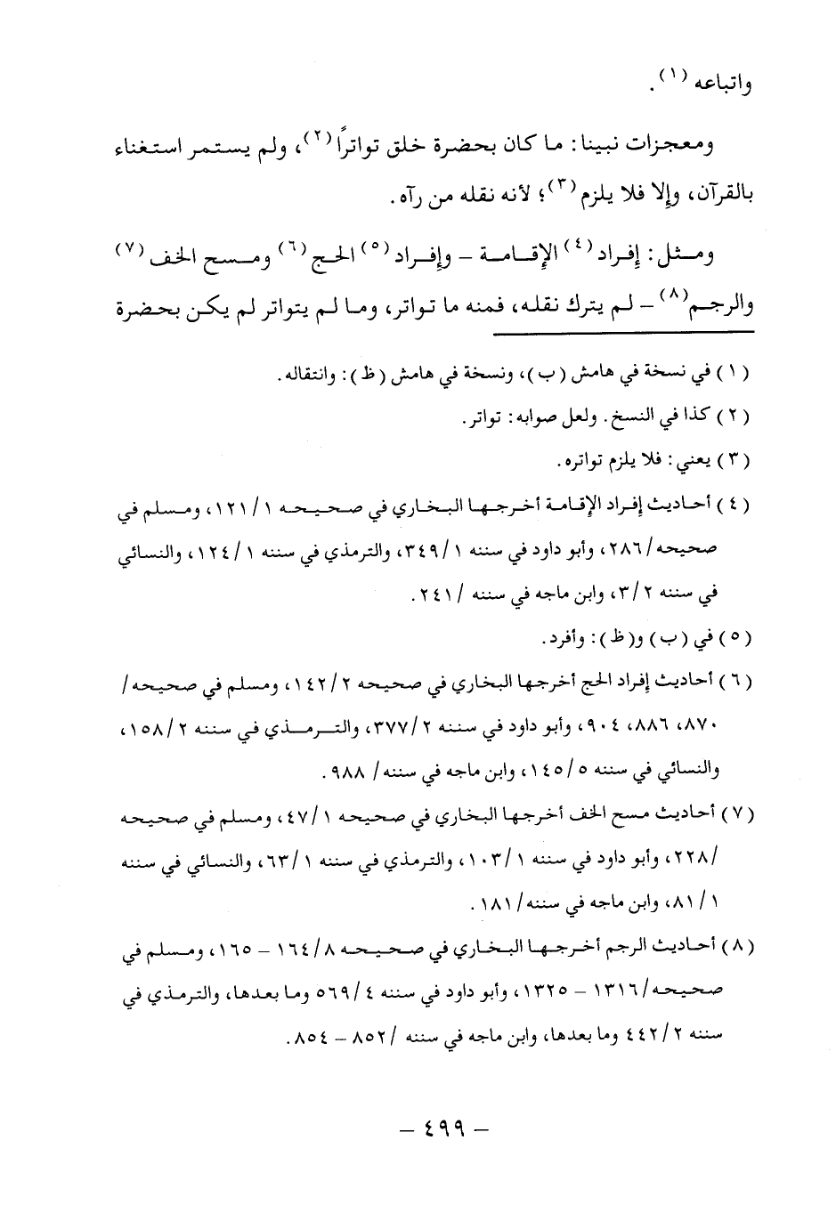 ومثل: إِفراد (٤) الإِقامة -وإِفراد (٥) الحج (٦) ومسح الخف (٧) والرجم (٨) - لم يترك نقله، فمنه ما تواتر، وما لم يتواتر لم يكن بحضرة