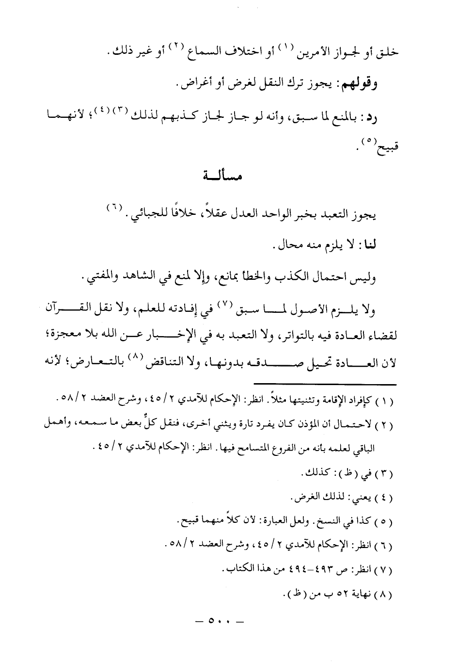 يجوز التعبد بخبر الواحد العدل عقلاً، خلافًا للجبائي. (٦)