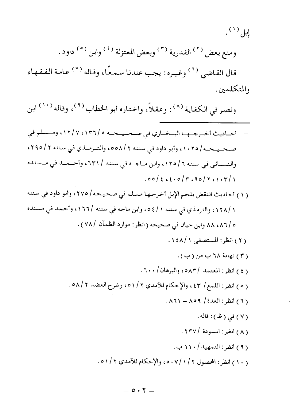 (١) أحاديث النقض بلحم الإبل أخرجها مسلم في صحيحه / ٢٧٥، وأبو داود في سننه ١/ ١٢٨، والترمذي في سننه ١/ ٥٤، وابن ماجه في سننه/ ١٦٦، وأحمد في مسنده ٥/ ٨٦، ٨٨ وابن حبان في صحيحه (انظر: موارد الظمآن / ٧٨).