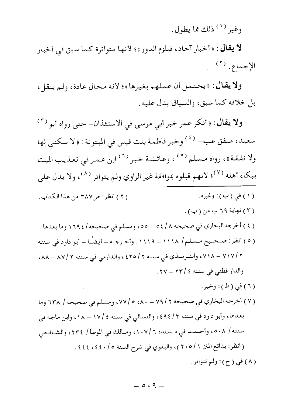 ولا يقال: "أنكر عمر خبر أبي موسى في الاستئذان -حتى رواه أبو (٣) سعيد، متفق عليه- (٤) وخبر فاطمة بنت قيس في المبتوتة: "لا سكنى لها ولا نفقة"، رواه مسلم (٥)، وعائشة خبر (٦) ابن عمر في تعذيب الميت ببكاء أهله (٧)؛ لأنهم قبلوه بموافقة غير الراوي ولم يتواتر (٨)، ولا يدل على
