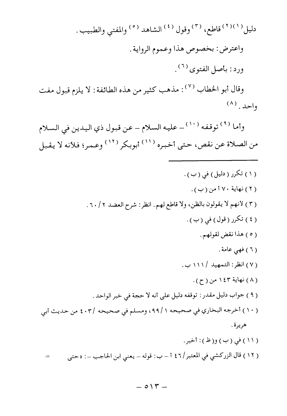 وقال أبو الخطاب (٧): مذهب كثير من هذه الطائفة: لا يلزم قبول مفت واحد. (٨)