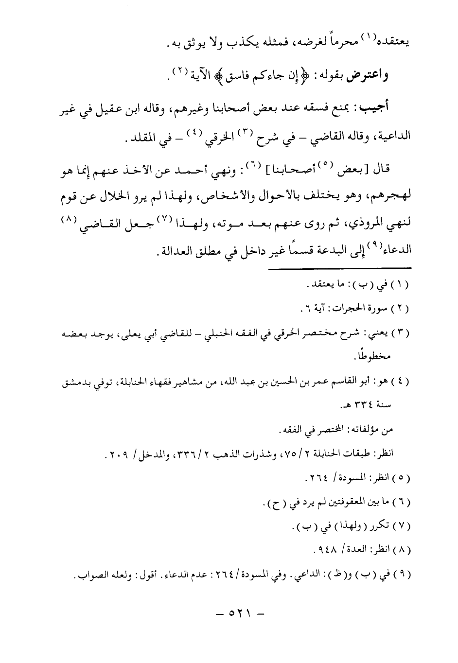 أجيب: بمنع فسقه عند بعض أصحابنا وغيرهم، وقاله ابن عقيل في غير الداعية، وقاله القاضي -في شرح (٣) الخرقي (٤) - في المقلد.