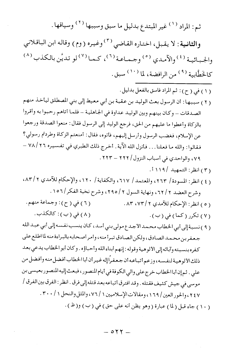 والثانية: لا يقبل، اختاره القاضي (٣) وغيره (وم) وقاله ابن الباقلاني والجبائية (٤) والآمدي (٥) وجماعة (٦)، كما (٧) لو تديَّن بالكذب (٨) كالخَطَّابية (٩) من الرافضة، لما (١٠) سبق.