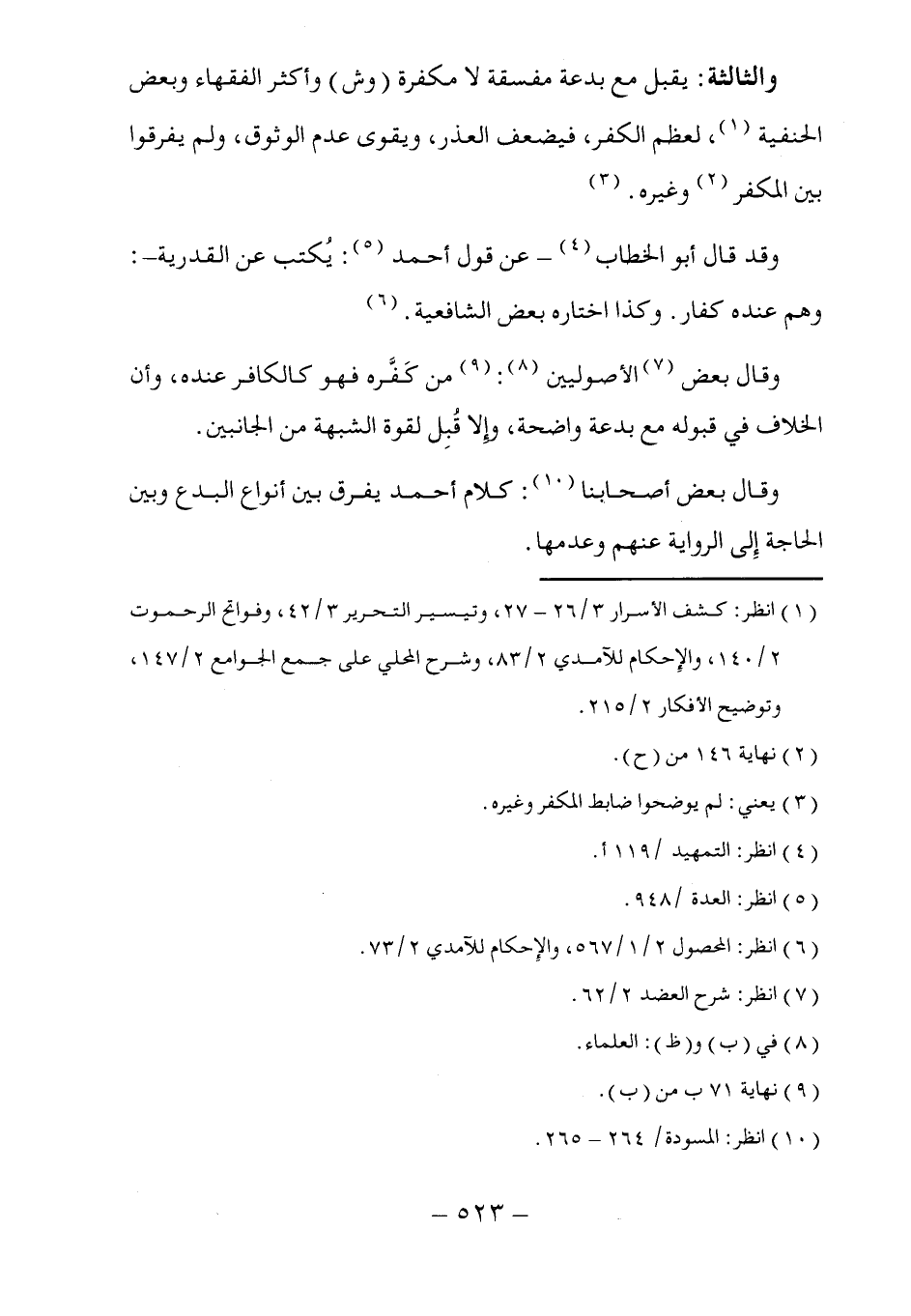 والثالثة: يقبل مع بدعة مفسقة لا مكفرة (وش) وأكثر الفقهاء وبعض الحنفية (١)، لعظم الكفر، فيضعف العذر، ويقوى عدم الوثوق، ولم يفرقوا بين المكفر (٢) وغيره. (٣)
