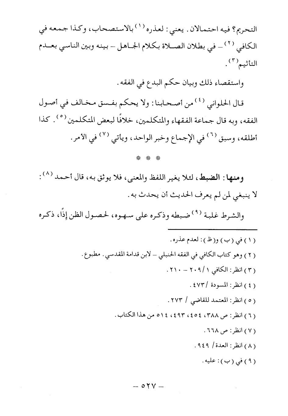 ومنها: الضبط، لئلا يغير اللفظ والمعنى، فلا يوثق به، قال أحمد (٨): لا ينبغي لمن لم يعرف الحديث أن يحدث به.