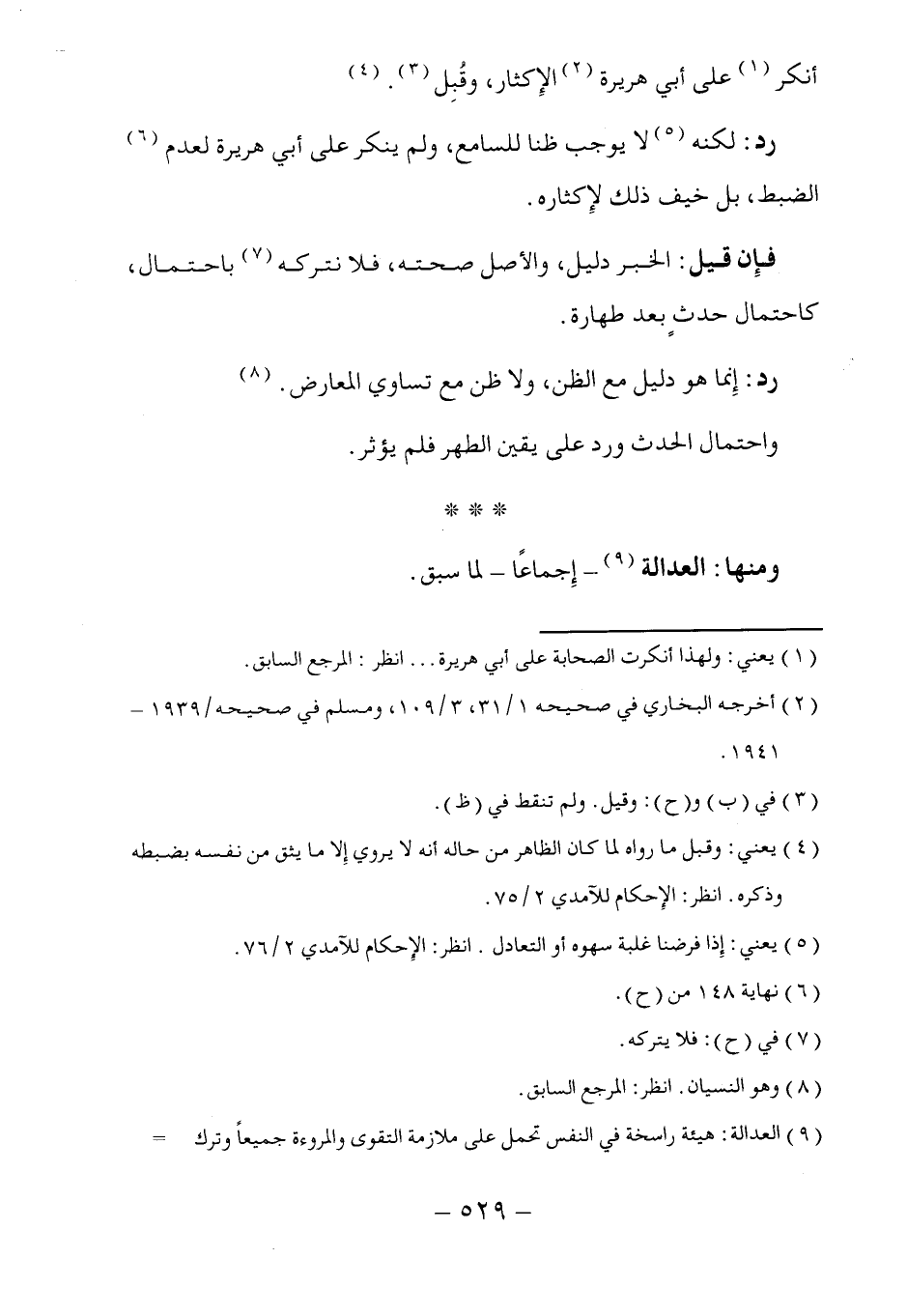 (٩) العدالة: هيئة راسخة في النفس تحمل على ملازمة التقوى والمروءة جميعاً وترك=