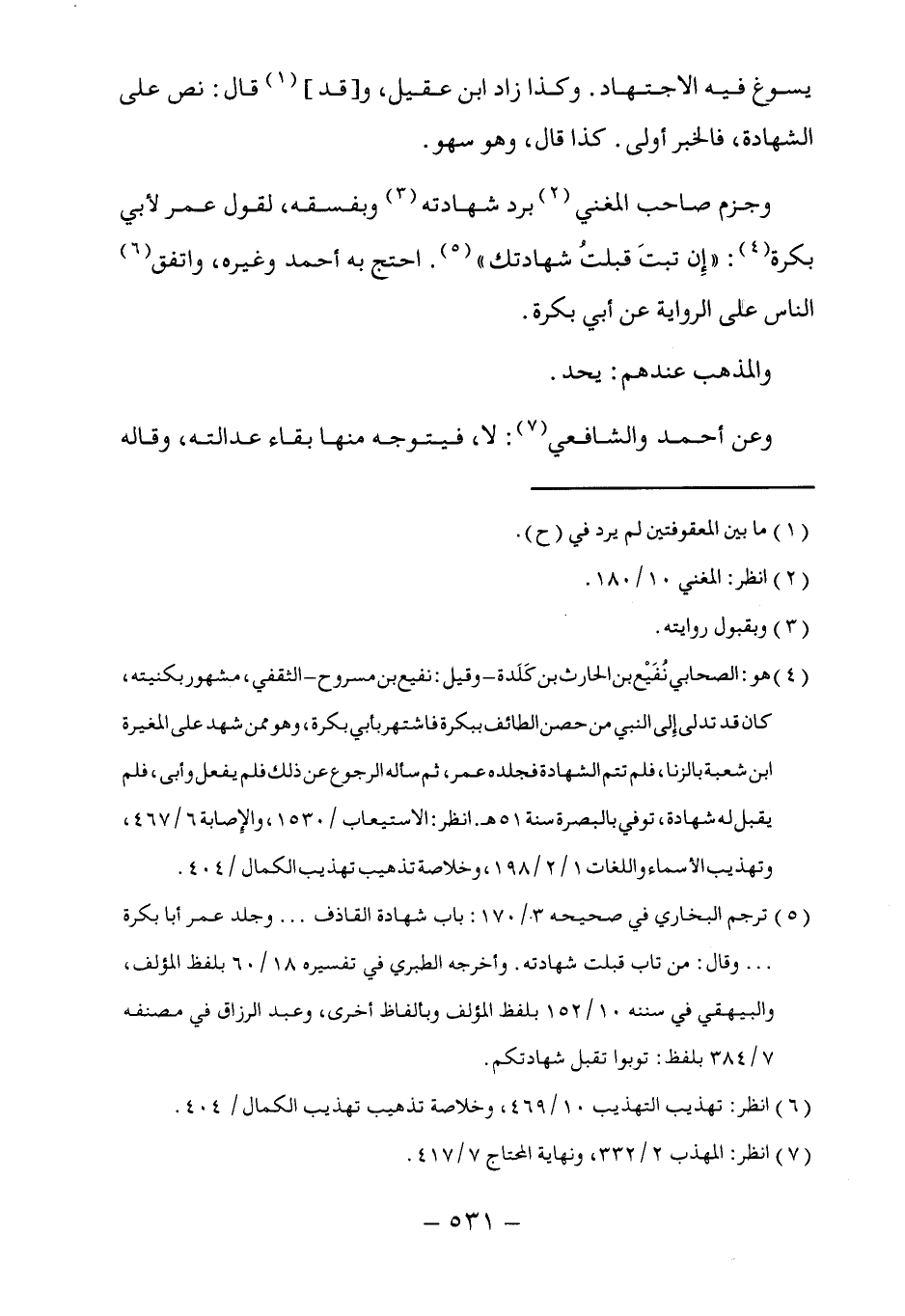 (٤) هو: الصحابي نُفَيْع بن الحارث بن كَلَدة -وقيل: نفيع بن مسروح- الثقفي، مشهور بكنيته، كان قد تدلى إلى النبي من حصن الطائف ببكرة فاشتهر بأبي بكرة، وهو ممن شهد على المغيرة ابن شعبة بالزنا، فلم تتم الشهادة فجلده عمر، ثم سأله الرجوع عن ذلك فلم يفعل وأبى، فلم يقبل له شهادة، توفي بالبصرة سنة ٥١ هـ. انظر: الاستيعاب/ ١٥٣٠، والإِصابة ٦/ ٤٦٧، وتهذيب الأسماء واللغات ١/ ٢/ ١٩٨، وخلاصة تذهيب تهذيب الكمال/ ٤٠٤.