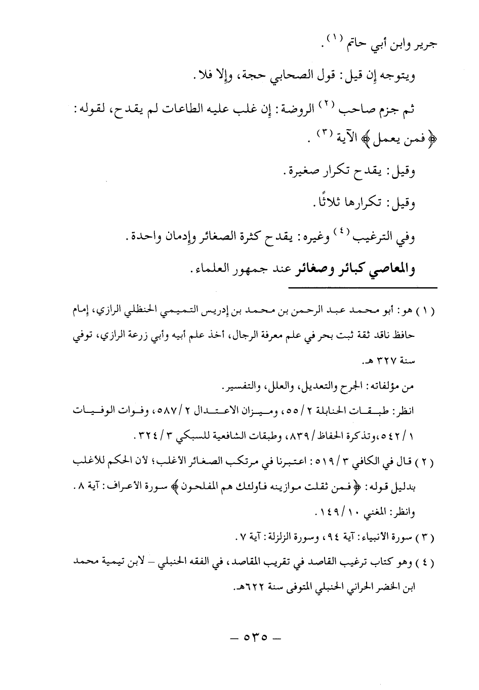 (١) هو: أبو محمَّد عبد الرحمن بن محمَّد بن إِدريس التميمي الحنظلي الرازي، إِمام حافظ ناقد ثقة ثبت بحر في علم معرفة الرجال، أخذ علم أبيه وأبي زرعة الرازي، توفي سنة ٣٢٧ هـ.
