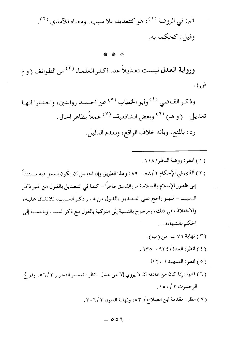 (٢) الذي في الإِحكام ٢/ ٨٨ - ٨٩: وهذا الطريق وإن احتمل أن يكون العمل فيه مستندًا إِلى ظهور الإِسلام والسلامة من الفسق ظاهرًا -كما في التعديل بالقول من غير ذكر السبب- فهو راجح على التعديل بالقول من غير ذكر السبب، للاتفاق عليه، والاختلاف في ذلك، ومرجوح بالنسبة إِلى التزكية بالقول مع ذكر السبب وبالنسبة إلى الحكم بالشهادة ...