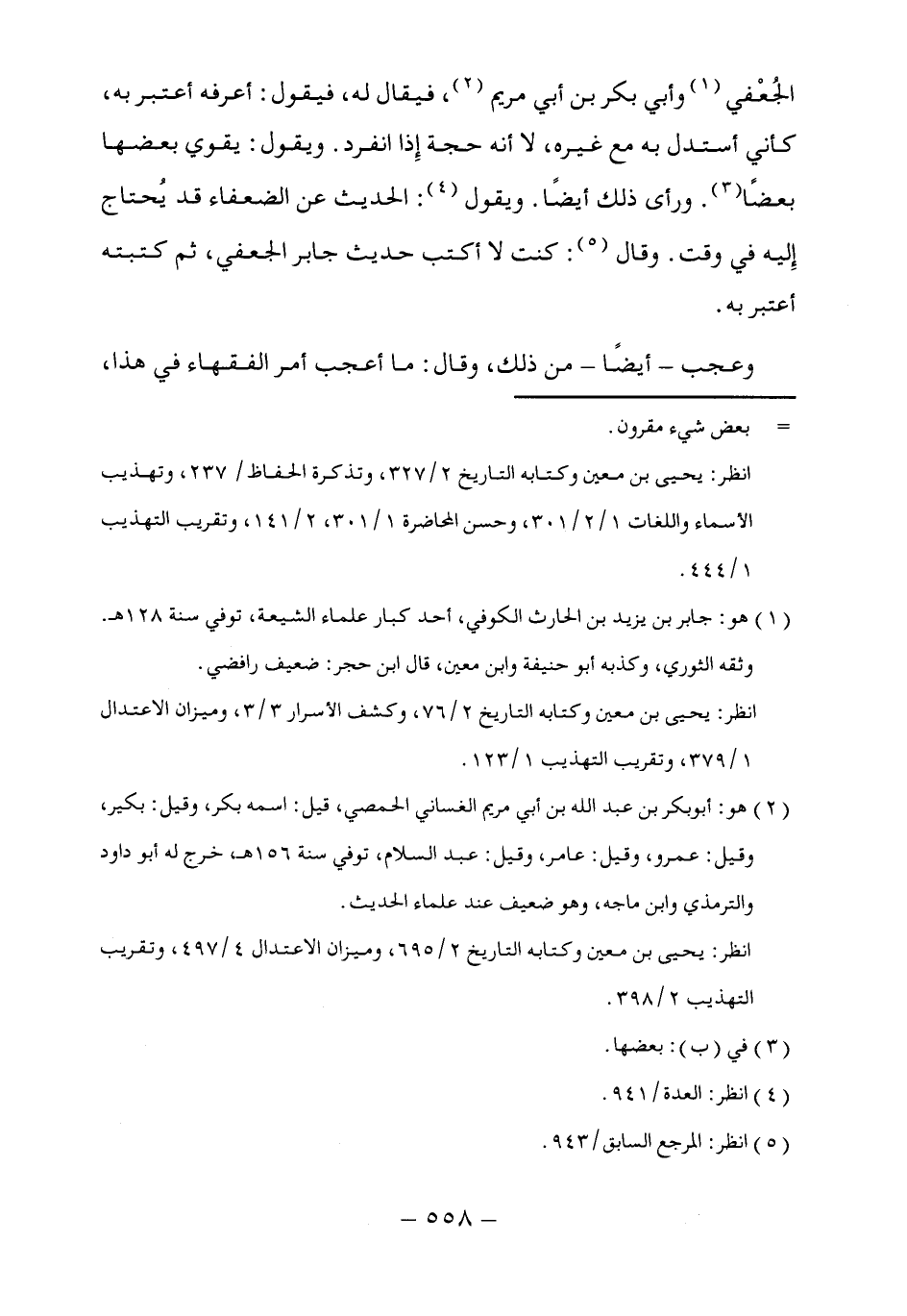 الجُعْفي (١) وأبي بكر بن أبي مريم (٢)، فيقال له، فيقول: أعرفه أعتبر به، كأني أستدل به مع غيره، لا أنه حجة إِذا انفرد. ويقول: يقوي بعضها بعضًا (٣). ورأى ذلك أيضًا. ويقول (٤): الحديث عن الضعفاء قد يُحتاج إِليه في وقت. وقال (٥): كنت لا أكتب حديث جابر الجعفي، ثم كتبته أعتبر به.