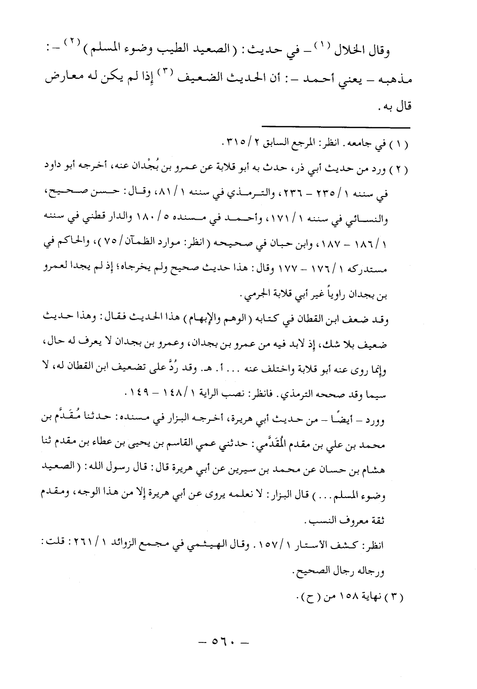 وقال الخلال (١) -في حديث: (الصعيد الطيب وضوء المسلم (٢) -: مذهبه -يعني أحمد-: أن الحديث الضعيف (٣) إِذا لم يكن له معارض قال به.