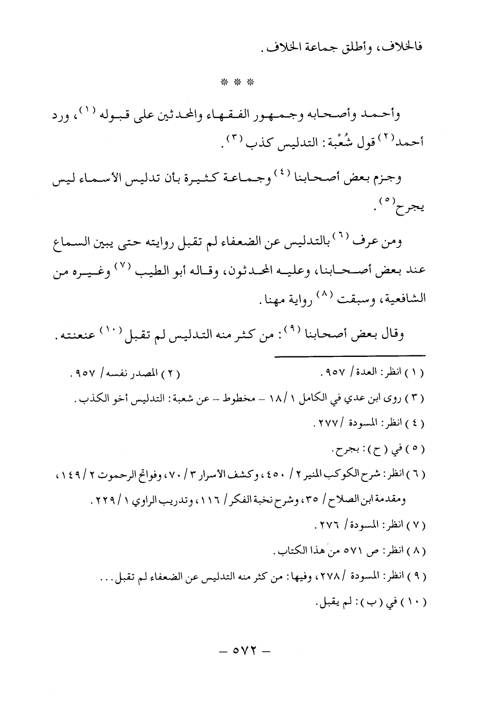 (٩) انظر: المسودة/ ٢٧٨، وفيها: من كثر منه التدليس عن الضعفاء لم تقبل ...