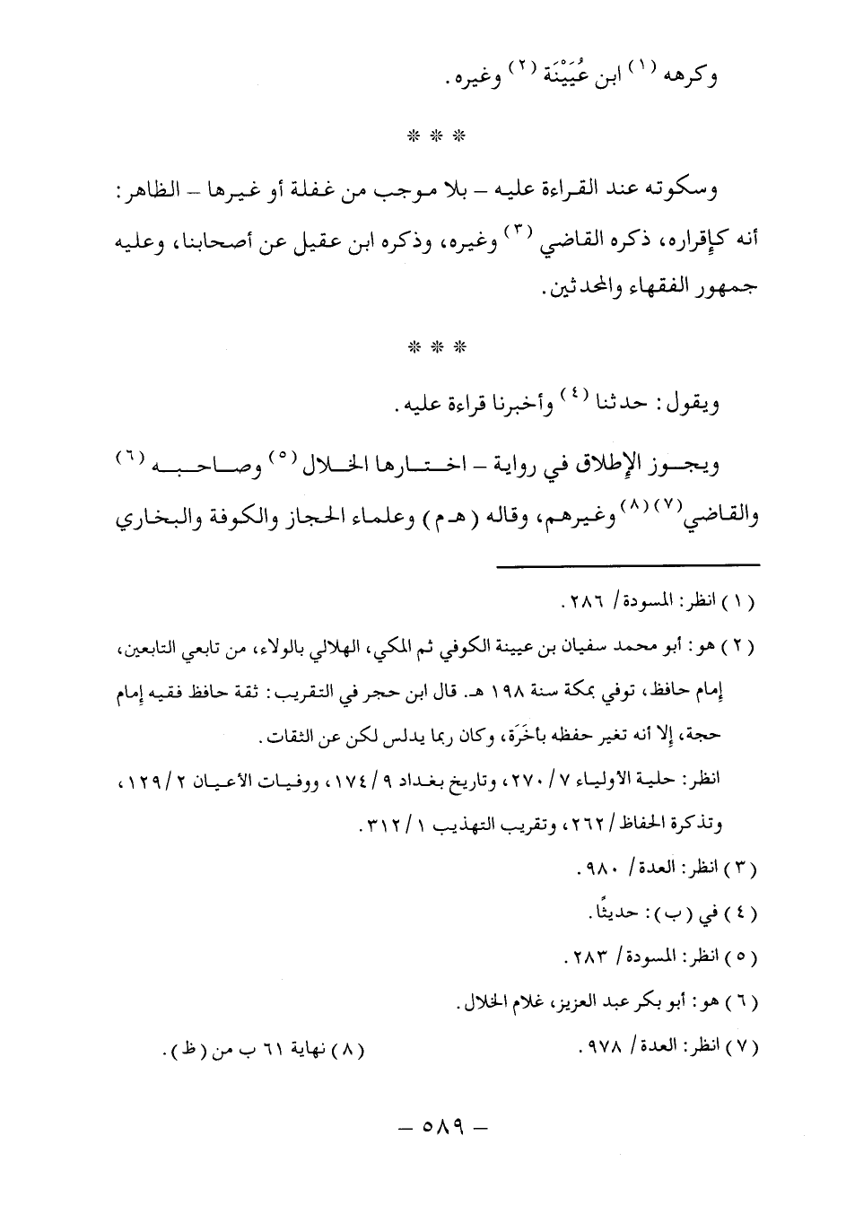(٢) هو: أبو محمَّد سفيان بن عيينة الكوفي ثم المكي، الهلالي بالولاء، من تابعي التابعين، إِمام حافظ، توفي بمكة سنة ١٩٨ هـ. قال ابن حجر في التقريب: ثقة حافظ فقيه إِمام حجة، إِلا أنه تغير حفظه باخَرَة، وكان ربما يدلس لكن عن الثقات.