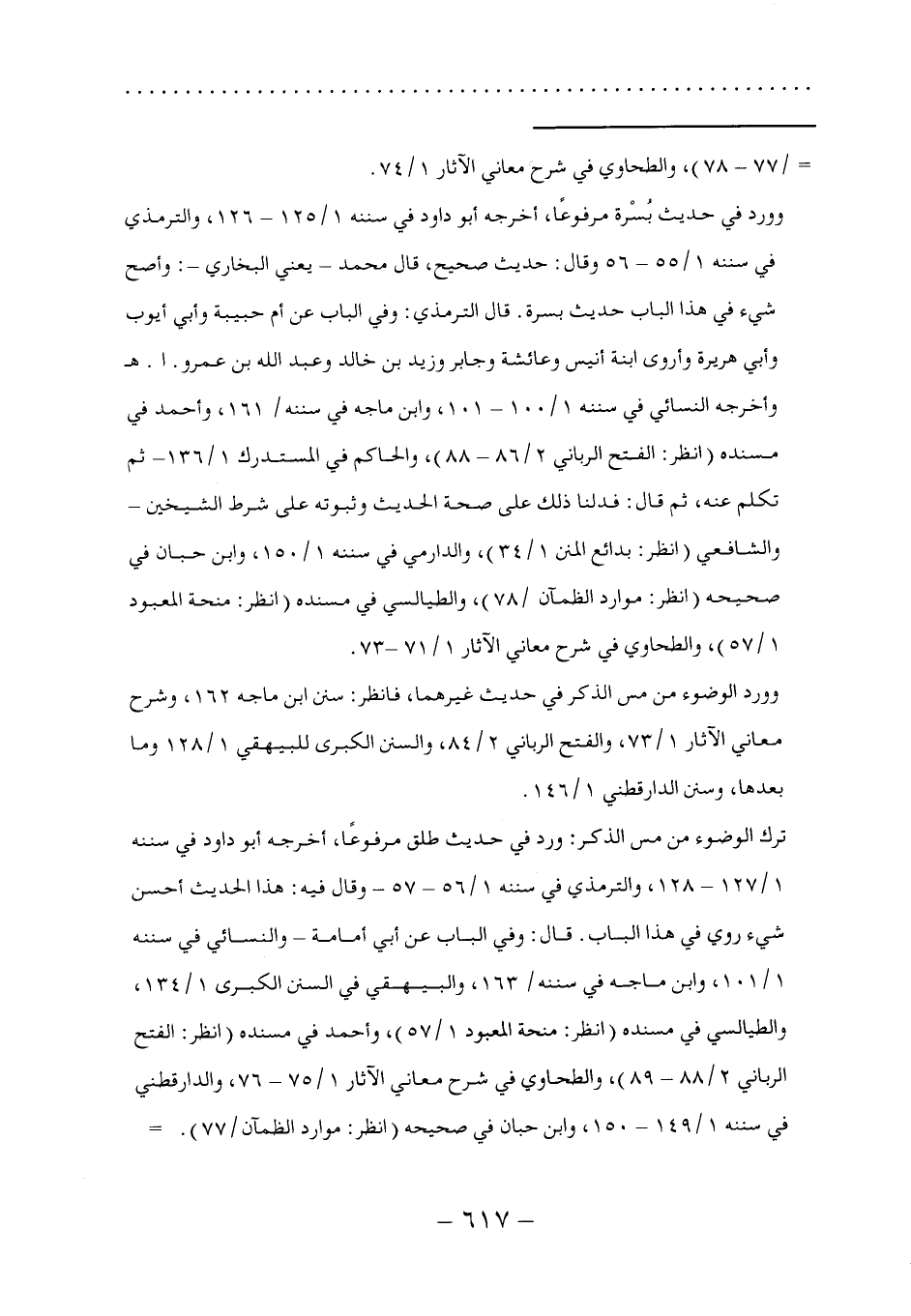 ترك الوضوء من مس الذكر: ورد في حديث طلق مرفوعًا، أخرجه أبو داود في سننه ١/ ١٢٧ - ١٢٨، والترمذي في سننه ١/ ٥٦ - ٥٧ - وقال فيه: هذا الحديث أحسن شيء روي في هذا الباب. قال: وفي الباب عن أبي أمامة- والنسائي في سننه ١/ ١٠١، وابن ماجه في سننه/ ١٦٣، والبيهقي في السنن الكبرى ١/ ١٣٤، والطيالسي في مسنده (انظر: منحة المعبود ١/ ٥٧)، وأحمد في مسنده (انظر: الفتح الرباني ٢/ ٨٨ - ٨٩)، والطحاوي في شرح معاني الآثار ١/ ٧٥ - ٧٦، والدارقطني في سننه ١/ ١٤٩ - ١٥٠، وابن حبان في صحيحه (انظر: موارد الظمآن/ ٧٧).=