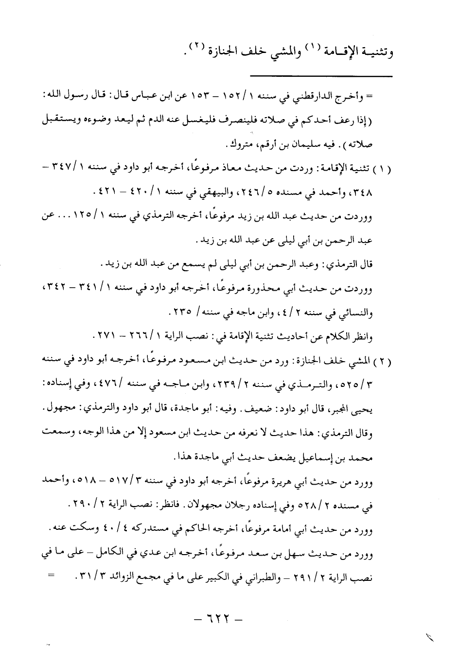 (٢) المشي خلف الجنازة: ورد من حديث ابن مسعود مرفوعاً، أخرجه أبو داود في سننه ٣/ ٥٢٥، والترمذي في سننه ٢/ ٢٣٩، وابن ماجه في سننه/ ٤٧٦، وفي إِسناده: يحيى المجبر، قال أبو داود: ضعيف. وفيه: أبو ماجدة، قال أبو داود والترمذي: مجهول. وقال الترمذي: هذا حديث لا نعرفه من حديث ابن مسعود إِلا من هذا الوجه، وسمعت محمَّد بن إِسماعيل يضعف حديث أبي ماجدة هذا.