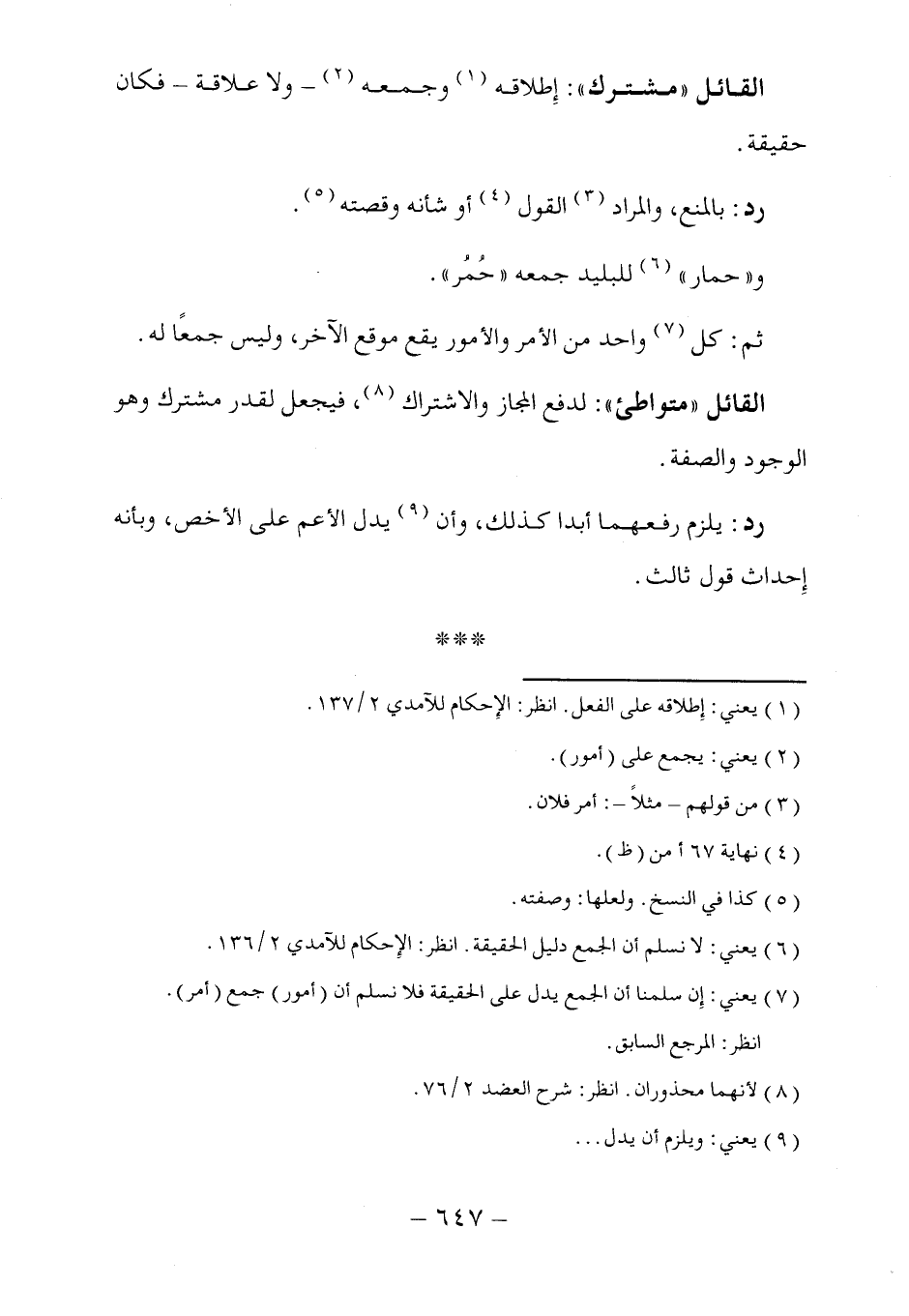 القائل "متواطئ": لدفع المجاز والاشتراك (٨)، فيجعل لقدر مشترك وهو الوجود والصفة.