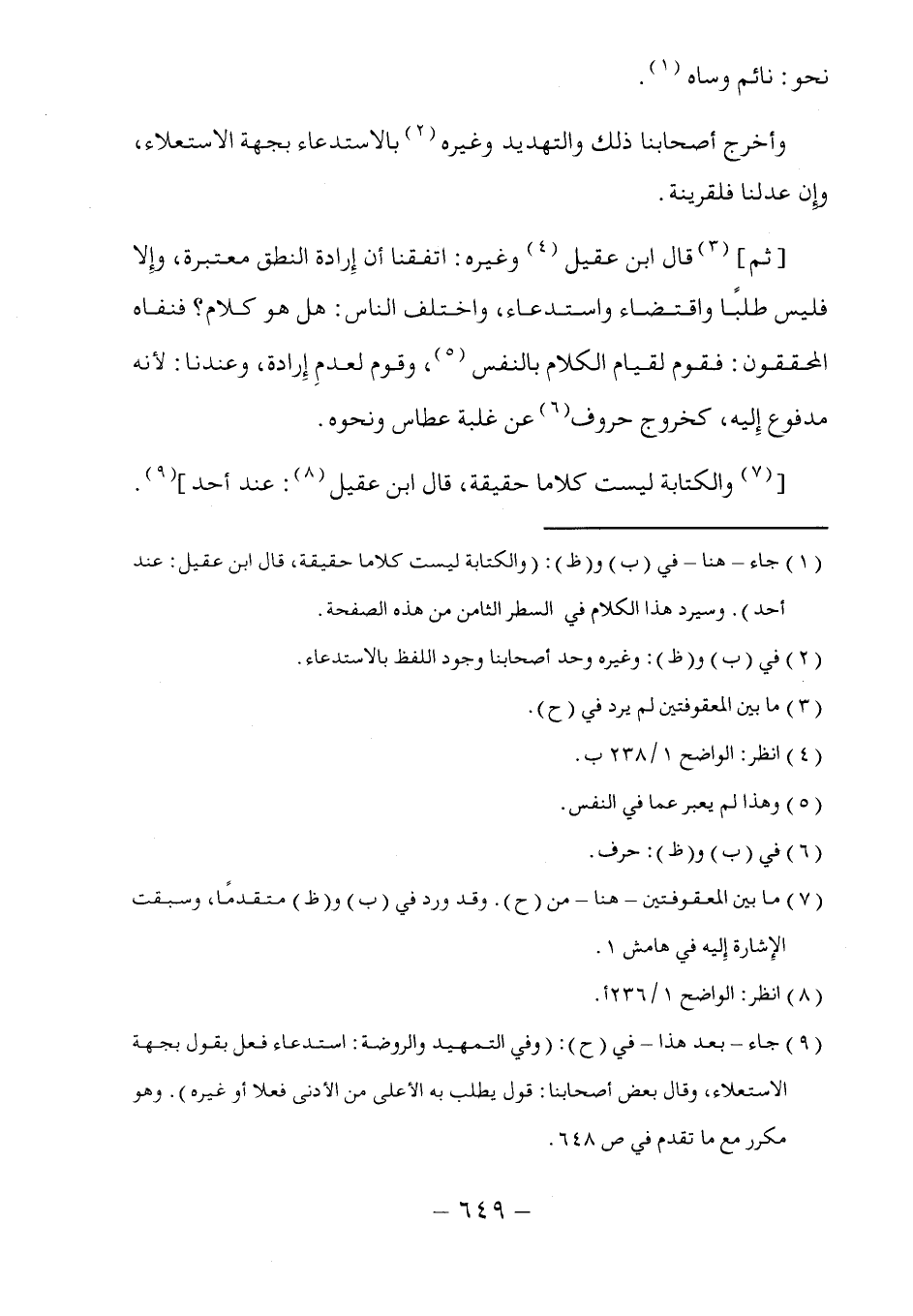 (٩) جاء -بعد هذا- في (ح): (وفي التمهيد والروضة: استدعاء فعل بقول بجهة الاستعلاء، وقال بعض أصحابنا: قول يطلب به الأعلى من الأدنى فعلا أو غيره). وهو مكرر مع ما تقدم في ص ٦٤٨.