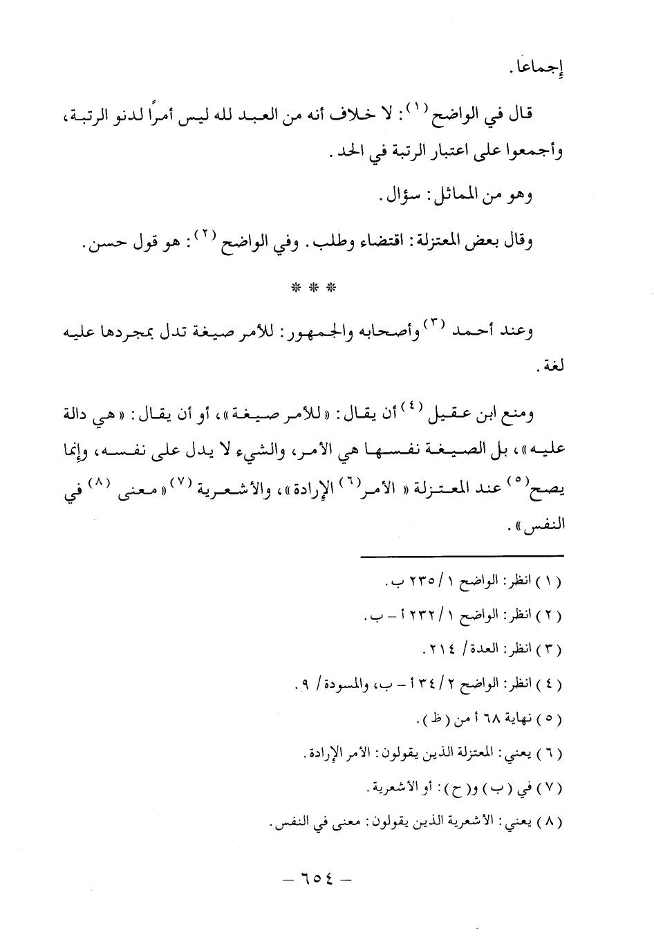 ومنع ابن عقيل (٤) أن يقال: "للأمر صيغة"، أو أن يقال: "هي دالة عليه"، بل الصيغة نفسها هي الأمر، والشيء لا يدل على نفسه، وإِنما يصح (٥) عند المعتزلة "الأمر (٦) الإِرادة"، والأشعرية (٧) "معنى (٨) في النفس".