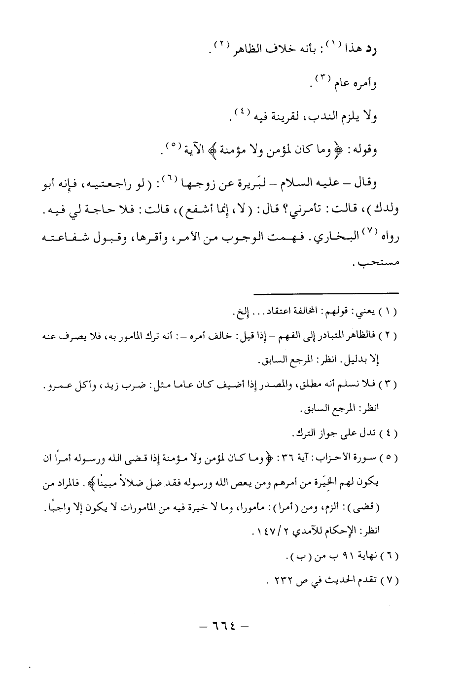 (٥) سورة الأحزاب: آية ٣٦: (وما كان لمؤمن ولا مؤمنة إِذا قضى الله ورسوله أمرًا أن يكون لهم الخِيَرة من أمرهم ومن يعص الله ورسوله فقد ضل ضلالاً مبينًا). فالمراد من (قضى): ألزم، ومن (أمرا): مأمورا، وما لا خيرة فيه من المأمورات لا يكون إِلا واجبًا.