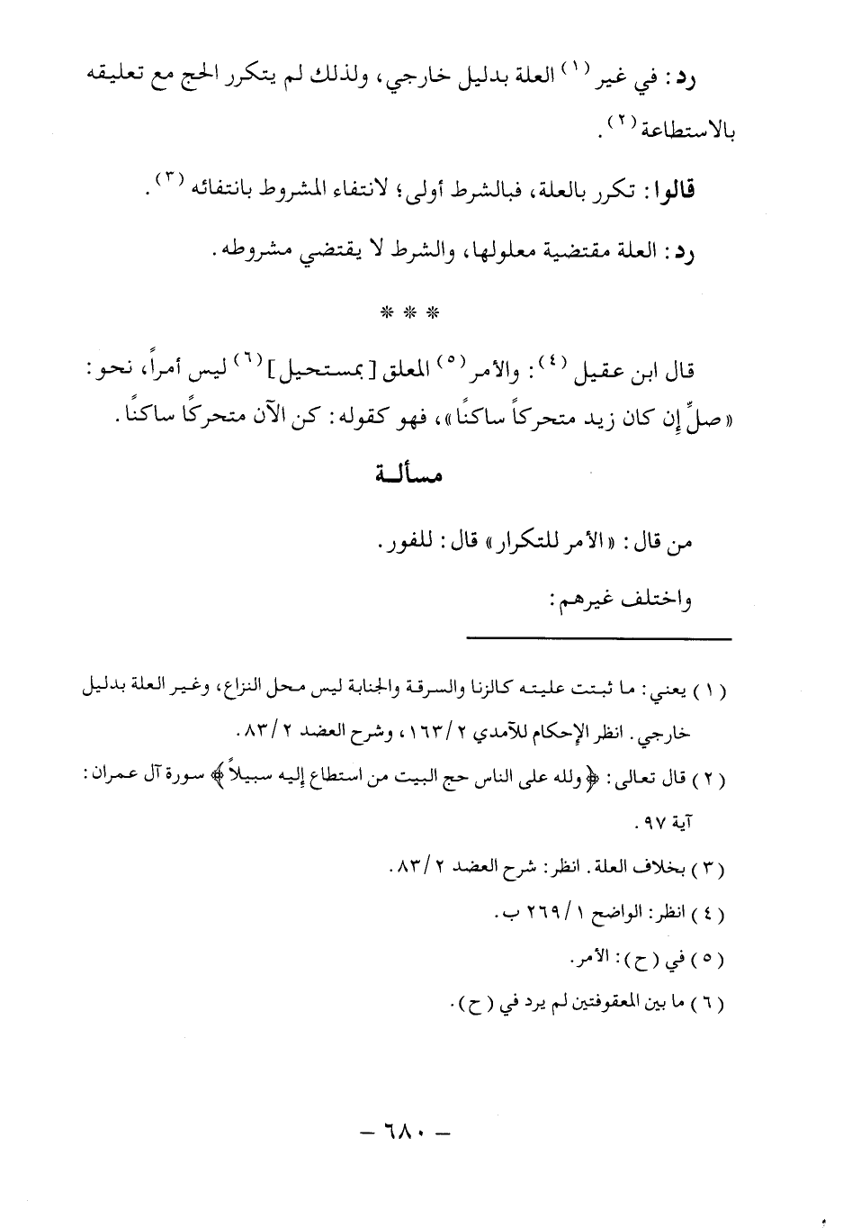 رد: في غير (١) العلة بدليل خارجي، ولذلك لم يتكرر الحج مع تعليقه بالاستطاعة (٢)