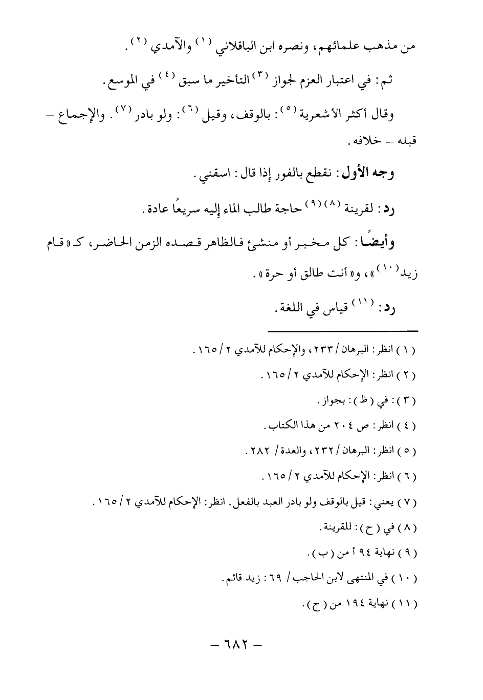 وقال أكثر الأشعرية (٥): بالوقف، وقيل (٦): ولو بادر (٧). والإِجماع -قبله- خلافه.