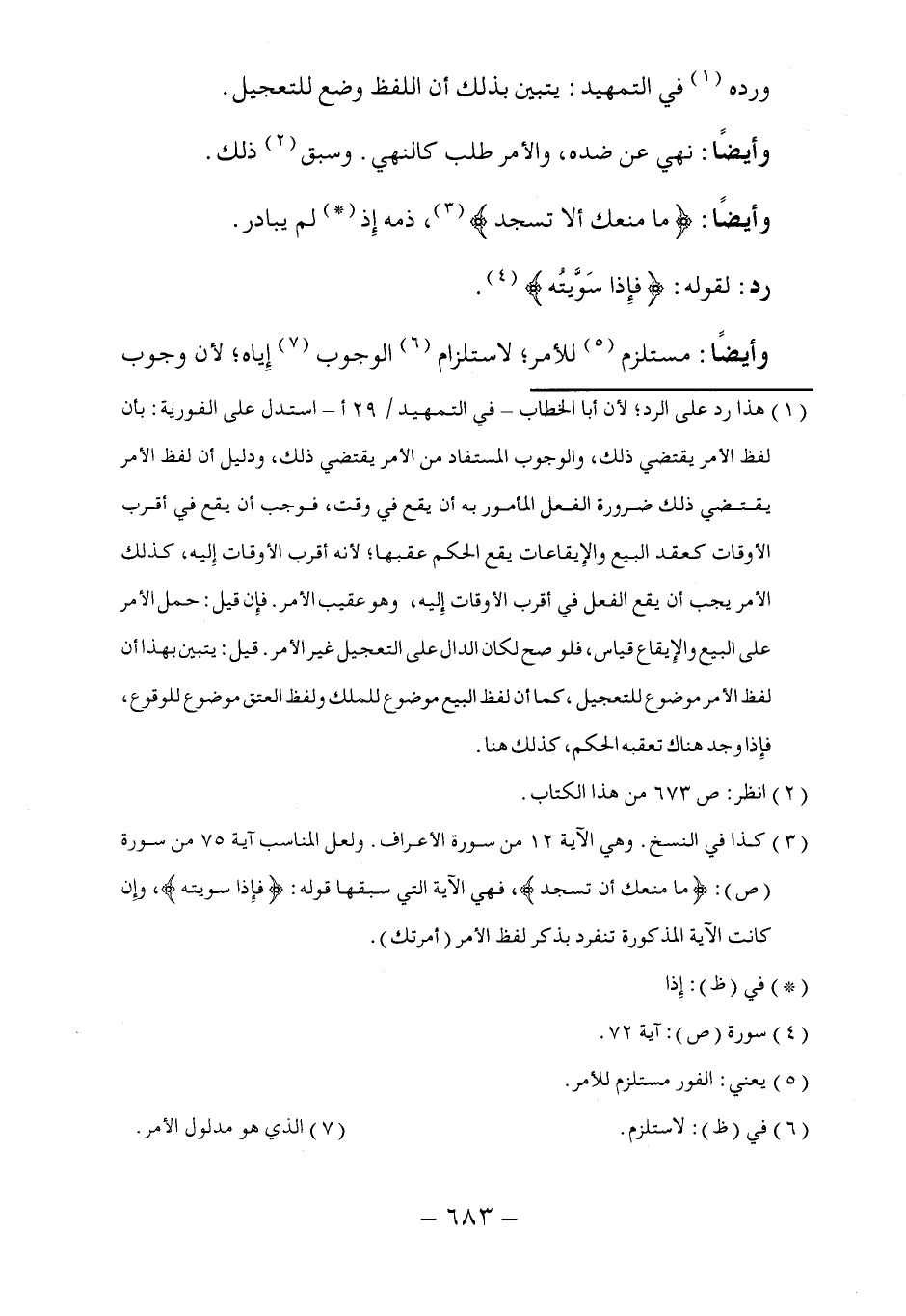 ورده (١) في التمهيد: يتبين بذلك أن اللفظ وضع للتعجيل.