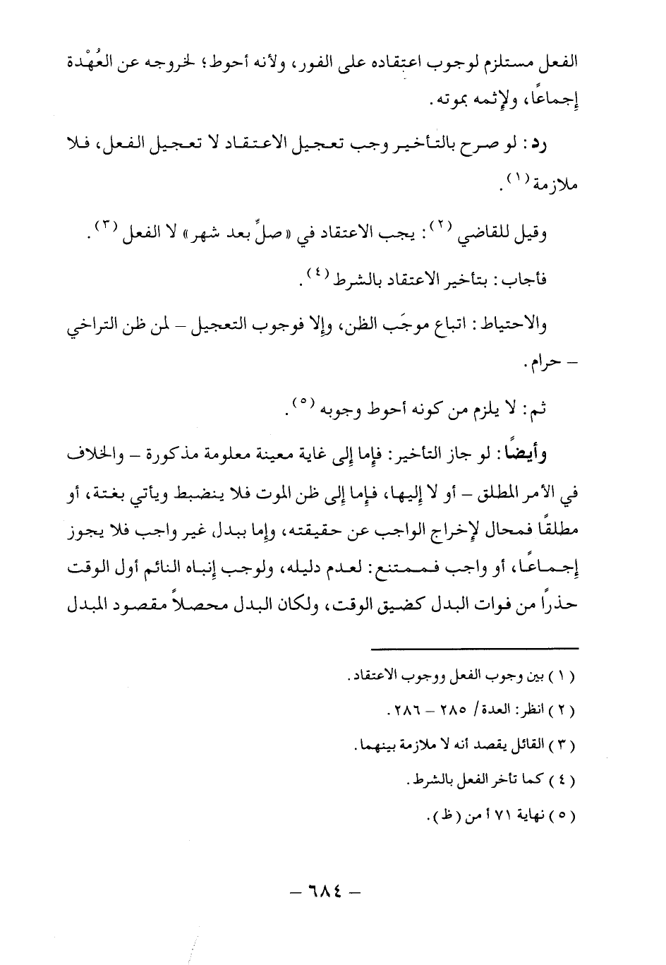 وأيضًا لو جاز التأخير: فإِما إِلى غاية معينة معلومة مذكورة -والخلاف في الأمر المطلق- أو لا إِليها، فإِما إِلى ظن الموت فلا ينضبط ويأتي بغتة، أو مطلقًا فمحال لإِخراج الواجب عن حقيقته، وإِما ببدل غير واجب فلا يجوز إِجماعًا، أو واجب فممتنع: لعدم دليله، ولوجب إِنباه النائم أول الوقت حذرًا من ذوات البدل كضيق الوقت، ولكان البدل محصلاً مقصود المبدل