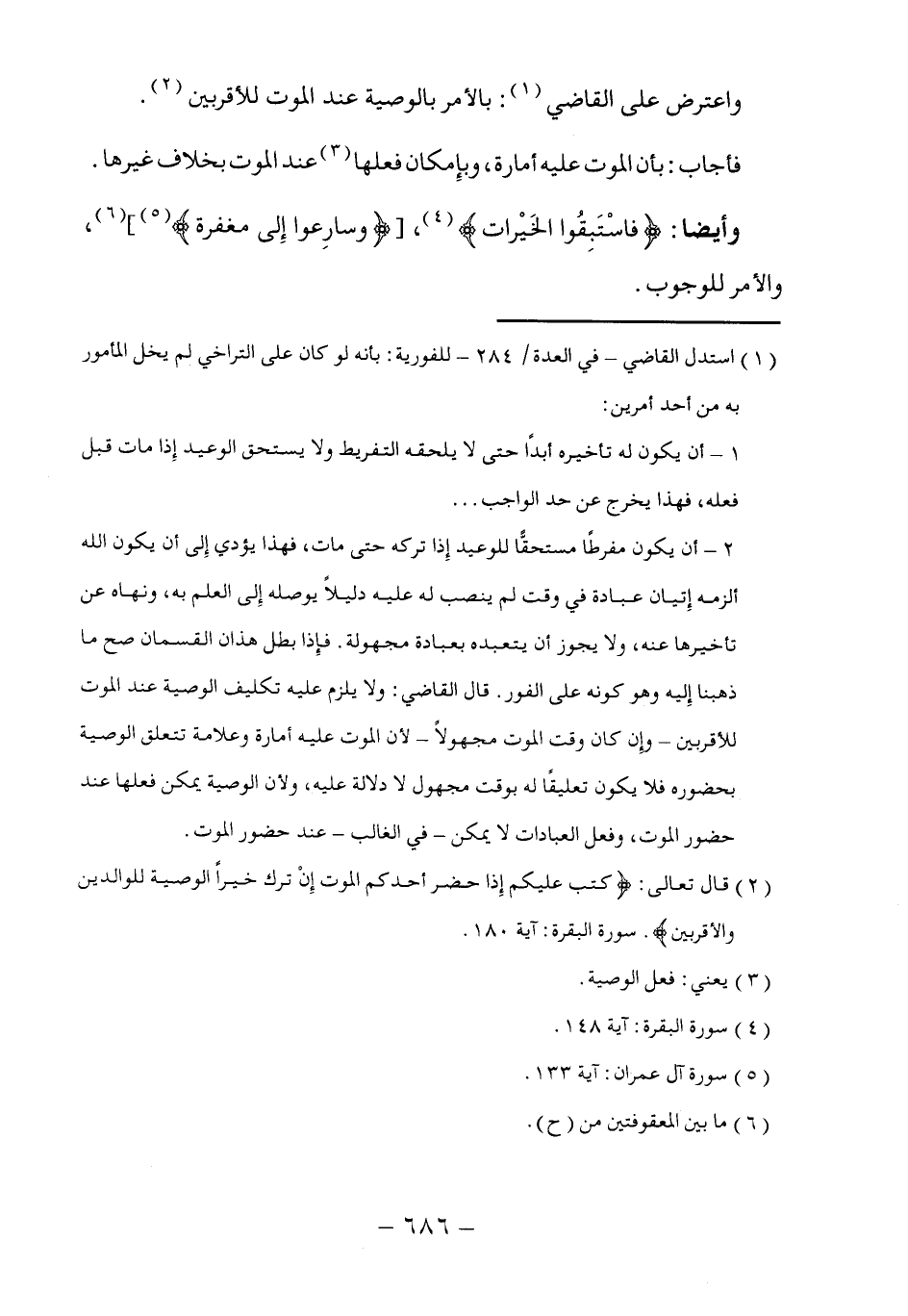 ٢ - أن يكون مفرطًا مستحقًّا للوعيد إِذا تركه حتى مات، فهذا يؤدي إِلى أن يكون الله ألزمه إِتيان عبادة في وقت لم ينصب له عليه دليلاً يوصله إِلى العلم به، ونهاه عن تأخيرها عنه، ولا يجوز أن يتعبده بعبادة مجهولة. فإذا بطل هذان القسمان صح ما ذهبنا إِليه وهو كونه على الفور. قال القاضي: ولا يلزم عليه تكليف الوصية عند الموت للأقربين -وإن كان وقت الموت مجهولاً- لأن الموت عليه أمارة وعلامة تتعلق الوصية بحضوره فلا يكون تعليقًا له بوقت مجهول لا دلالة عليه، ولأن الوصية يمكن فعلها عند حضور الموت، وفعل العبادات لا يمكن -في الغالب- عند حضور الموت.