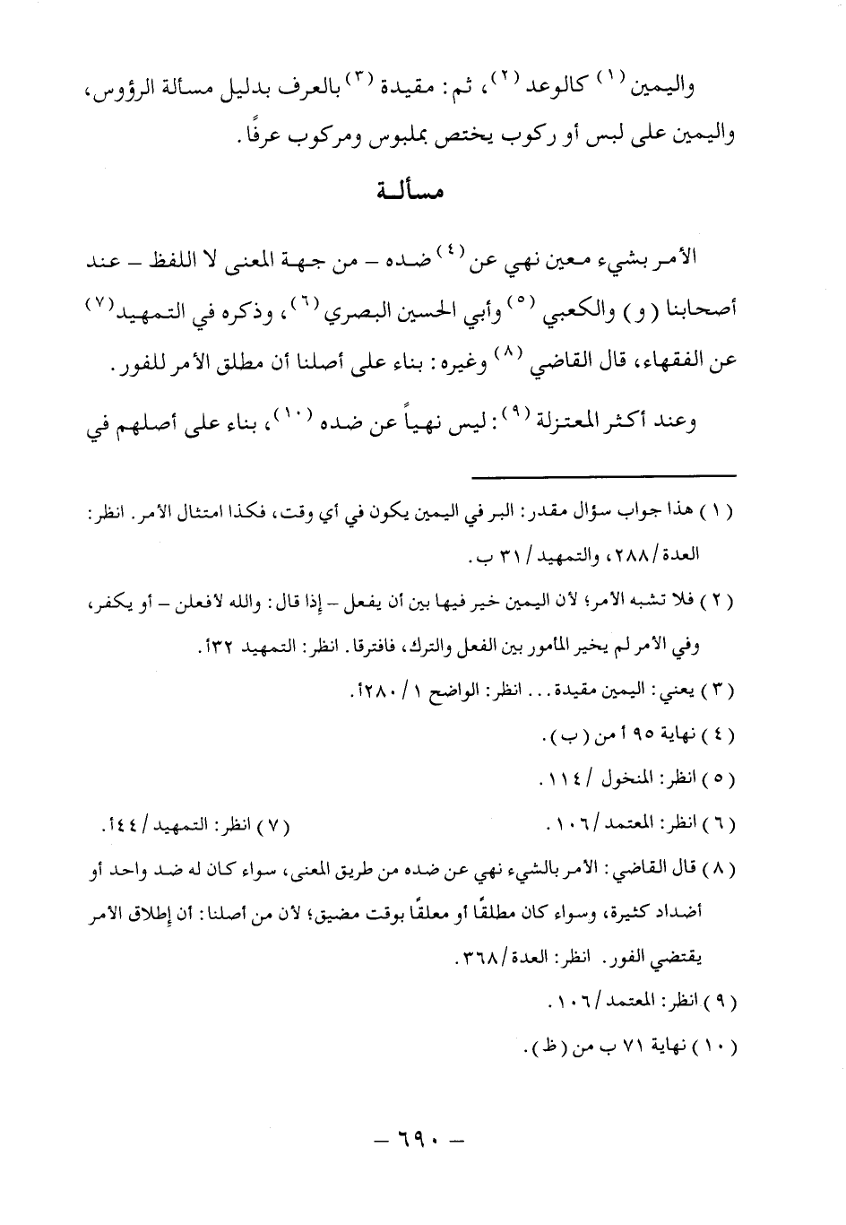(٨) قال القاضي: الأمر بالشيء نهي عن ضده من طريق المعنى، سواء كان له ضد واحد أو أضداد كثيرة، وسواء كان مطلقًا أو معلقًا بوقت مضيق؛ لأن من أصلنا: أن إِطلاق الأمر يقتضي الفور. انظر: العدة/ ٣٦٨.