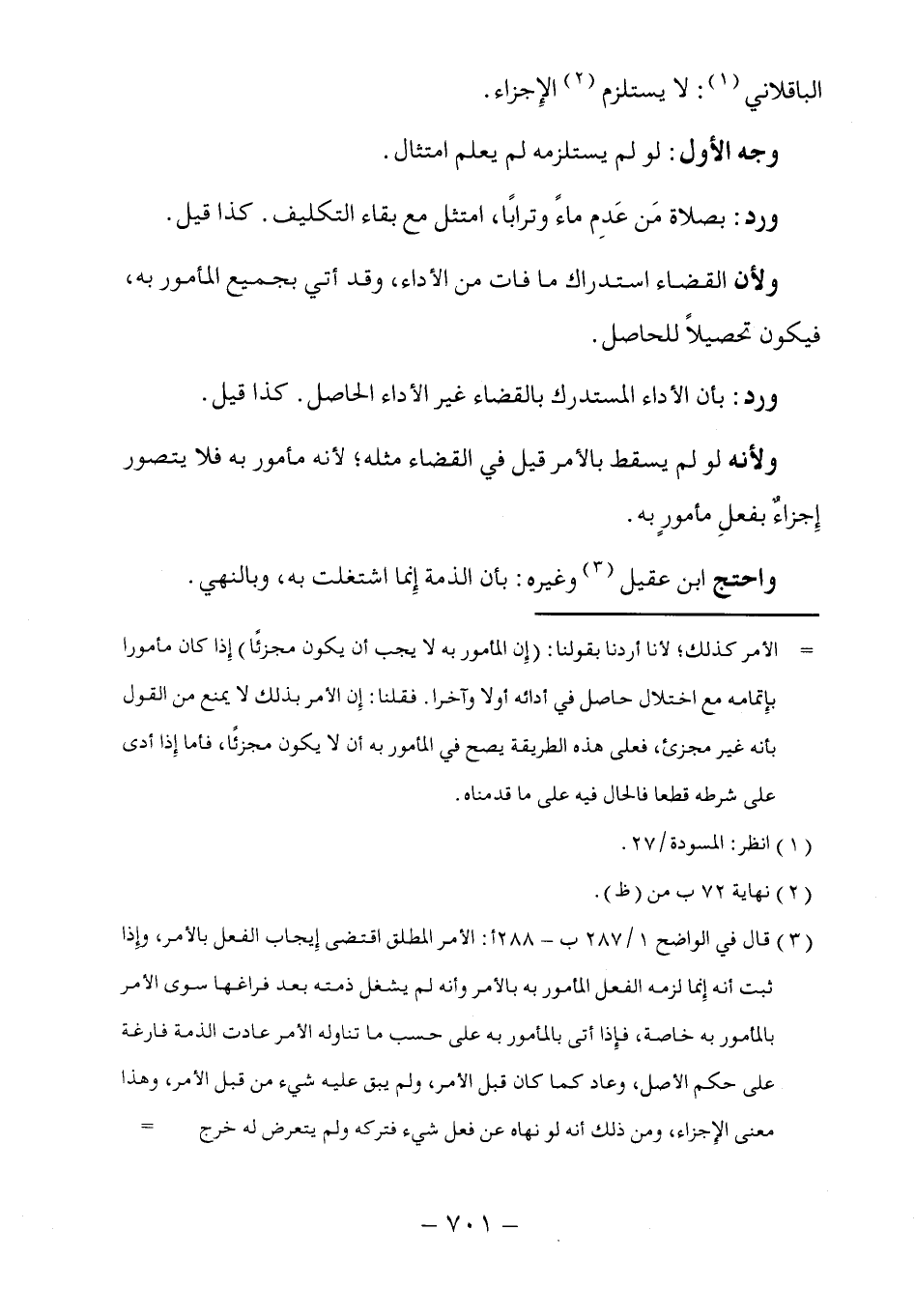 (٣) قال في الواضح ١/ ٢٨٧ ب- ٢٨٨ أ: الأمر المطلق اقتضى إِيجاب الفعل بالأمر، وإِذا ثبت أنه إِنما لزمه الفعل المأمور به بالأمر وأنه لم يشغل ذمته بعد فراغها سوى الأمر بالأمور به خاصة، فإِذا أتى بالمأمور به على حسب ما تناوله الأمر عادت الذمة فارغة على حكم الأصل، وعاد كما كان قبل الأمر، ولم يبق عليه شيء من قبل الأمر، وهذا معنى الإِجزاء، ومن ذلك أنه لو نهاه عن فعل شيء فتركه ولم يتعرض له خرج=