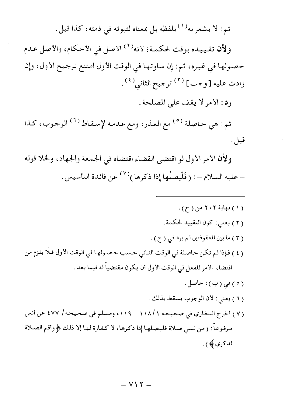 (٧) أخرج البخاري في صحيحه ١/ ١١٨ - ١١٩، ومسلم في صحيحه/ ٤٧٧ عن أنس مرفوعاً: (من نسي صلاة فليصلها إِذا ذكرها، لا كفارة لها إِلا ذلك (وأقم الصلاة لذكري)).