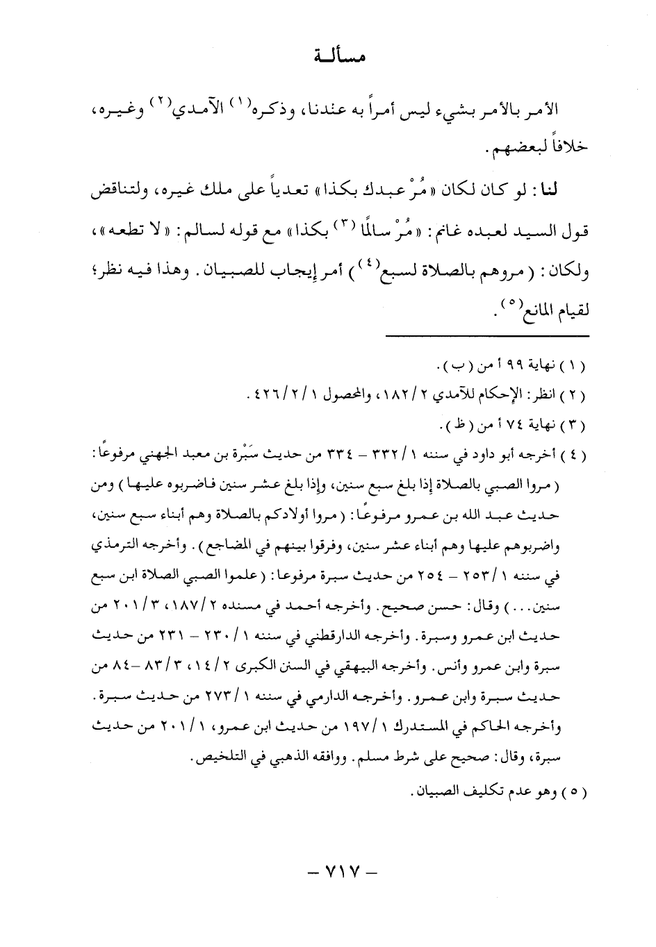 لنا: لو كان لكان "مُرْ عبدك بكذا" تعدياً على ملك غيره، ولتناقض قول السيد لعبده غانم: "مُرْ سالمًا (٣) بكذا" مع قوله لسالم: "لا تطعه"، ولكان: (مروهم بالصلاة لسبع (٤)) أمر إِيجاب للصبيان. وهذا فيه نظر؛ لقيام المانع (٥).
