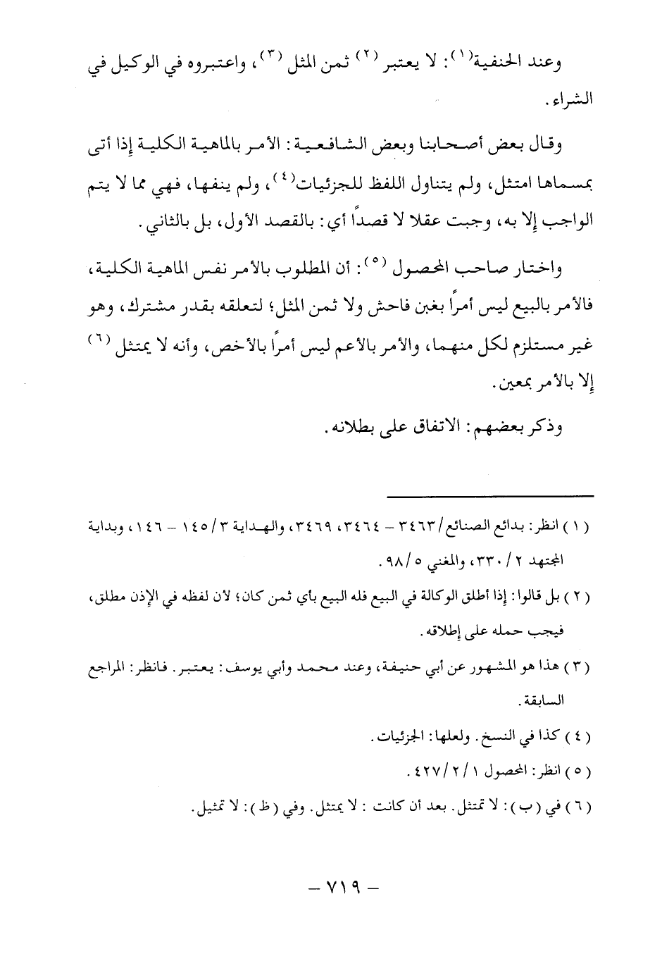 واختار صاحب المحصول (٥): أن المطلوب بالأمر نفس الماهية الكلية، فالامر بالبيع ليس أمرًا بغبن فاحش ولا ثمن المثل؛ لتعلقه بقدر مشترك، وهو غير مستلزم لكل منهما، والأمر بالأعم ليس أمرًا بالأخص، وأنه لا يمتثل (٦) إِلا بالأمر بمعين.