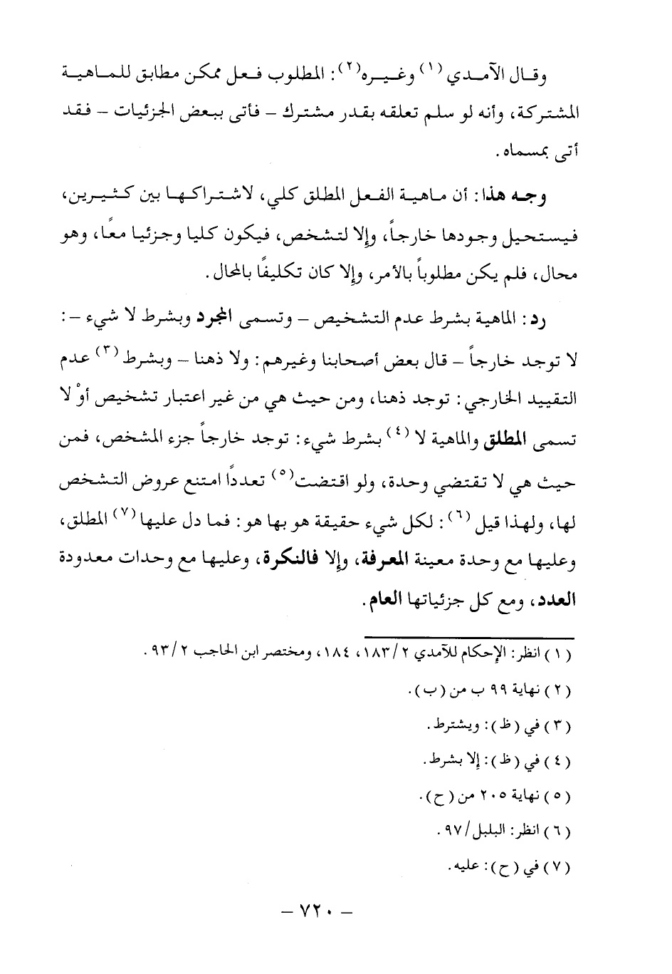 رد: الماهية بشرط عدم التشخيص -وتسمى المجرد وبشرط لا شيء-: لا توجد خارجاً -قال بعض أصحابنا وغيرهم: ولا ذهنا- وبشرط (٣) عدم التقييد الخارجي: توجد ذهنا، ومن حيث هي من غير اعتبار تشخيص أوْ لا تسمى المطلق والماهية لا (٤) بشرط شيء: توجد خارجاً جزء المشخص، فمن حيث هي لا تقتضي وحدة، ولو اقتضت (٥) تعددًا امتنع عروض التشخص لها، ولهذا قيل (٦): لكل شيء حقيقة هو بها هو: لنا دل عليها (٧) المطلق، وعليها مع وحدة معينة المعرفة، وإلا فالنكرة، وعليها مع وحدات معدودة العدد، ومع كل جزئياتها العام.